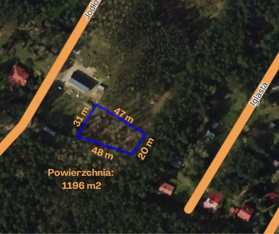Nieruchomość gruntowa ma kształt zbliżony do prostokąta o wymiarach 47 m x 31 m x 48 x 20 m i posiada powierzchnię 1196 m2.
