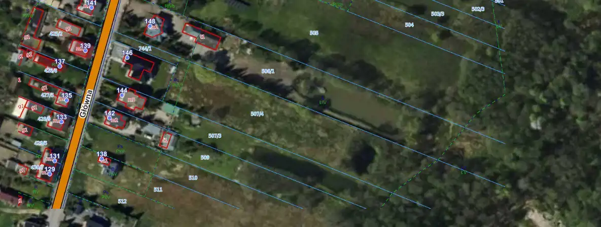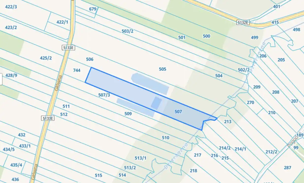 - działka (szerokość ok. 30 m) posiada drogę dojazdową (prywatna, nr: 744/1)