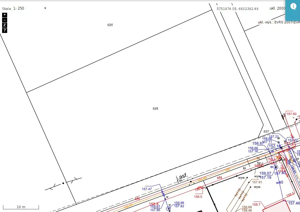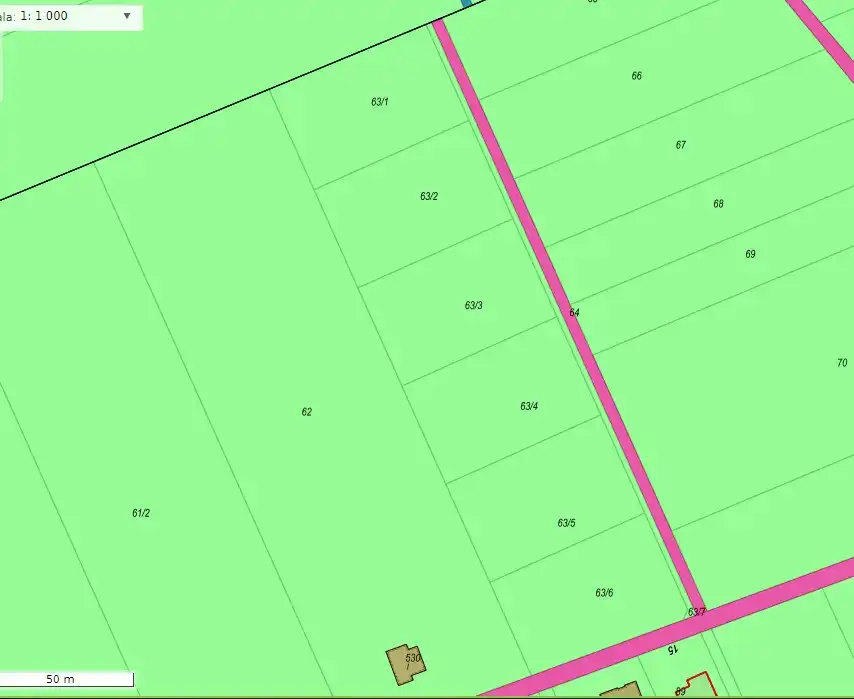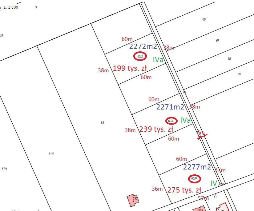 Do sprzedania działka o pow. 2277 m2 w kształcie prostokąta i wymiarach ok. 57 x 37 m. Działka narożna, możliwość wyboru frontu - bardzo szerokiego 57 m wzdłuż drogi asfaltowej lub 37 m wzdłuż drogi gruntowej prywatno-państwowej.
