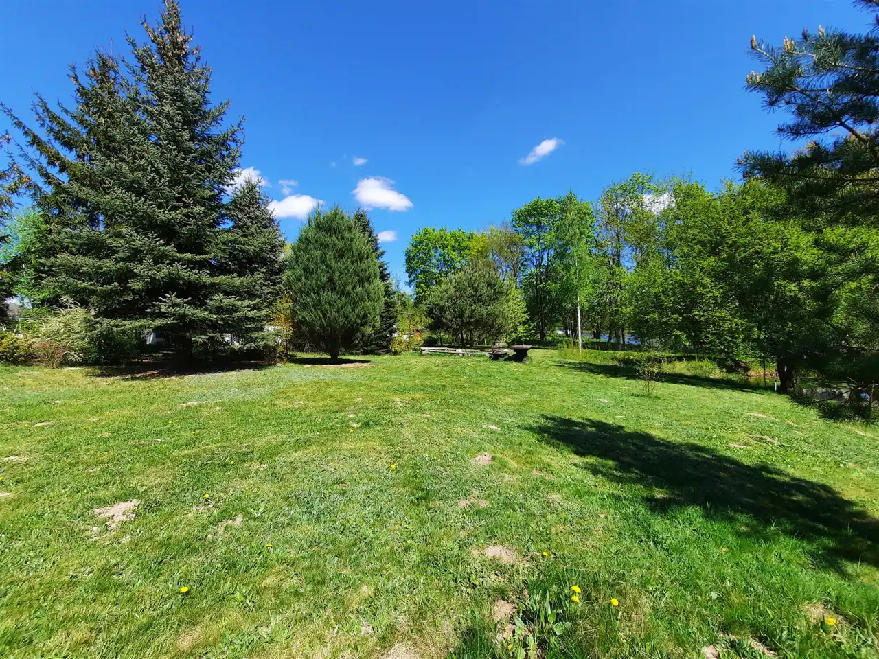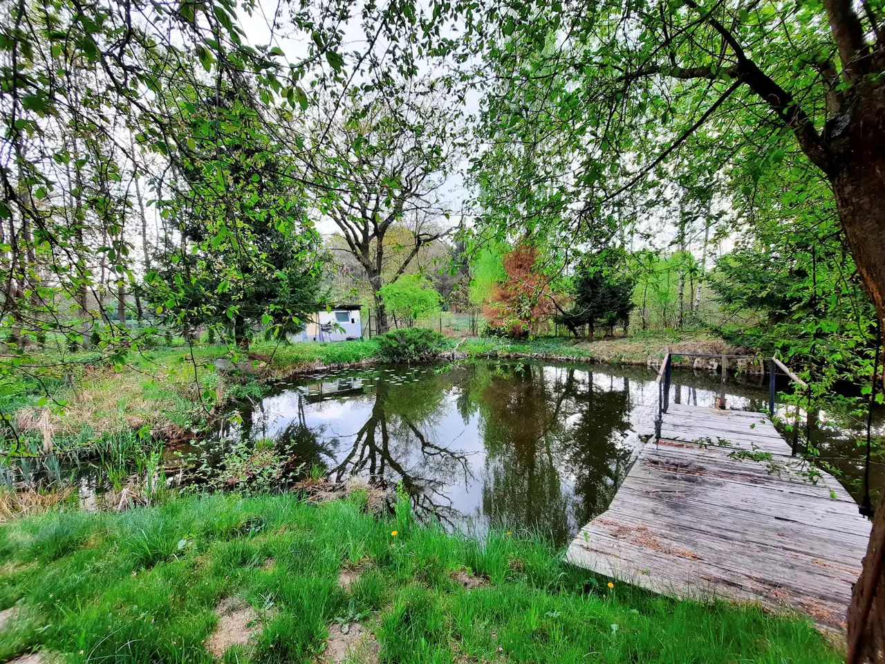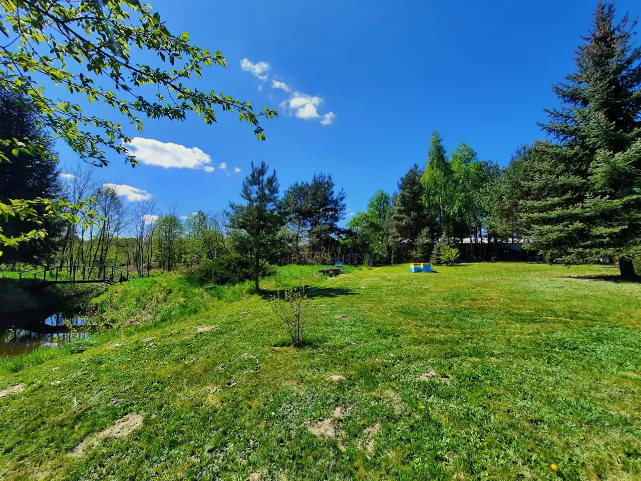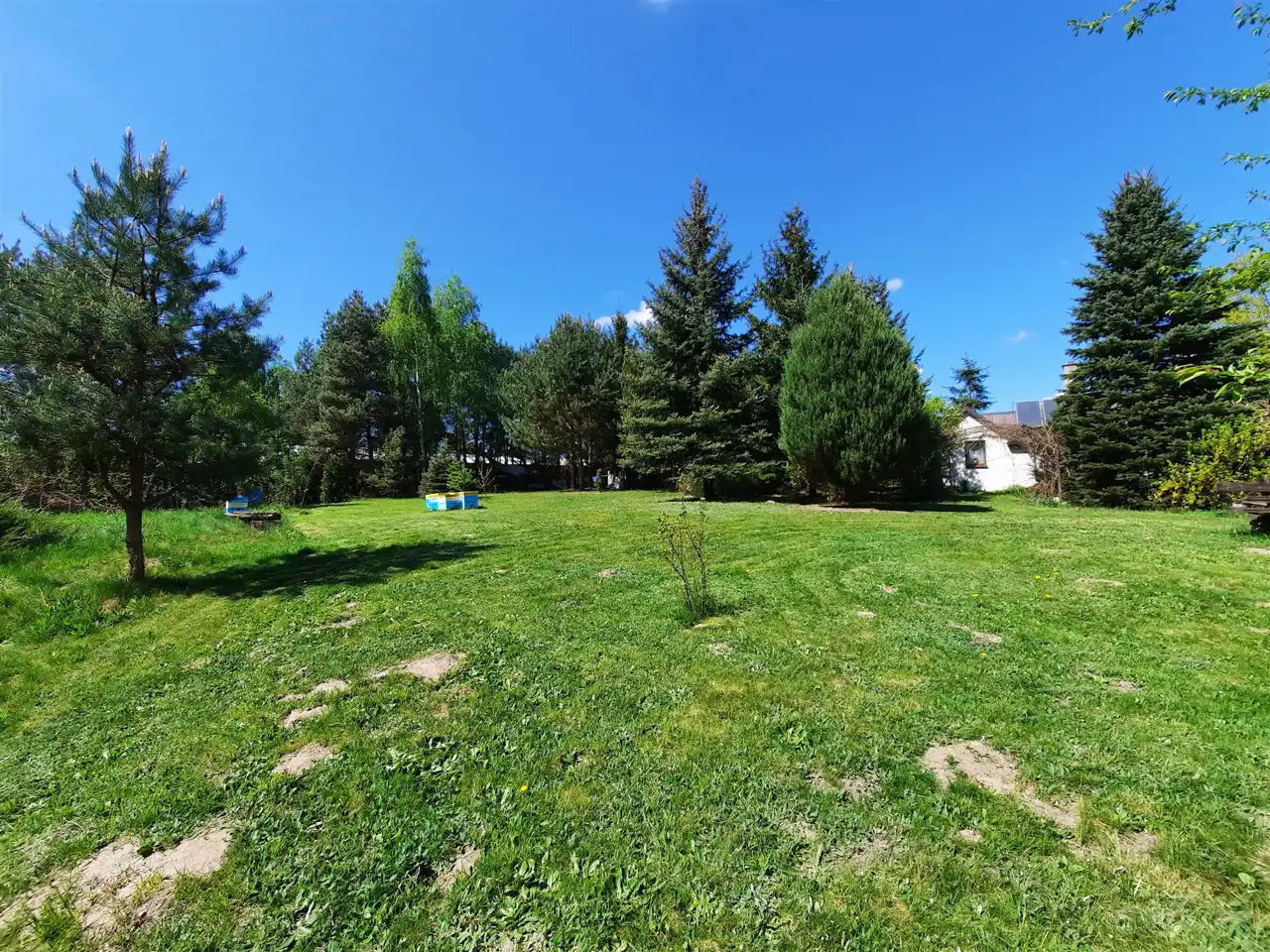 Działka o powierzchni 2706 m2, w kształcie zbliżonym do prostokąta o szerokości od 53 m do 64 m i głębokości od 38 m do 47 m, częściowo ogrodzona siatką. Wjazd na działkę północno-wschodni. Na działce znajduje się urokliwy staw z mostkiem i pomostem. Na działce liczne nasadzenia. W północnej części działki idealna polana pod budowę domu.