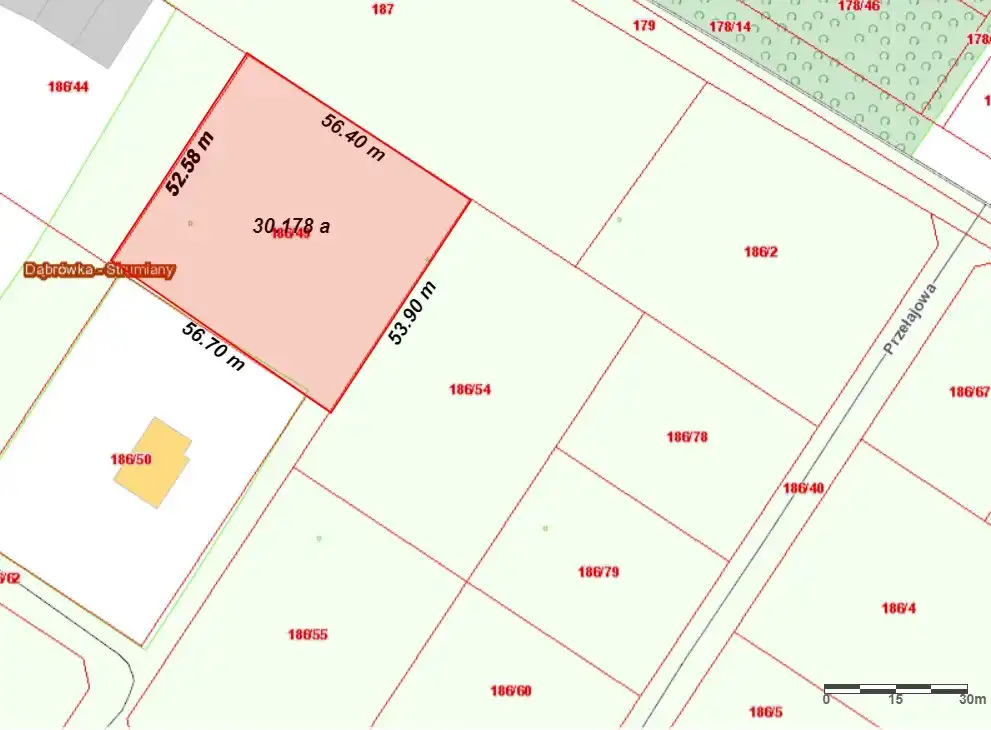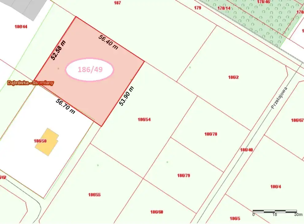 Działka nieogrodzona w kształcie prostokąta, zbliżonego kształtem do kwadratu. Parametry działki dają możliwość jej podziału, a także budowy domy typu bliźniak.