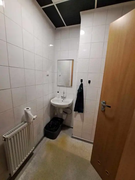 Na podłogach terakota a na ścianach gładź gipsowa. Sufit typu Amstrong z oświetleniem jarzeniowym.