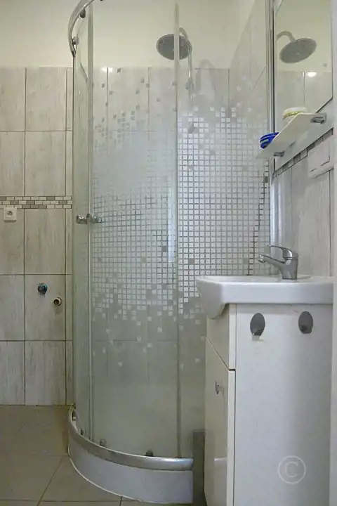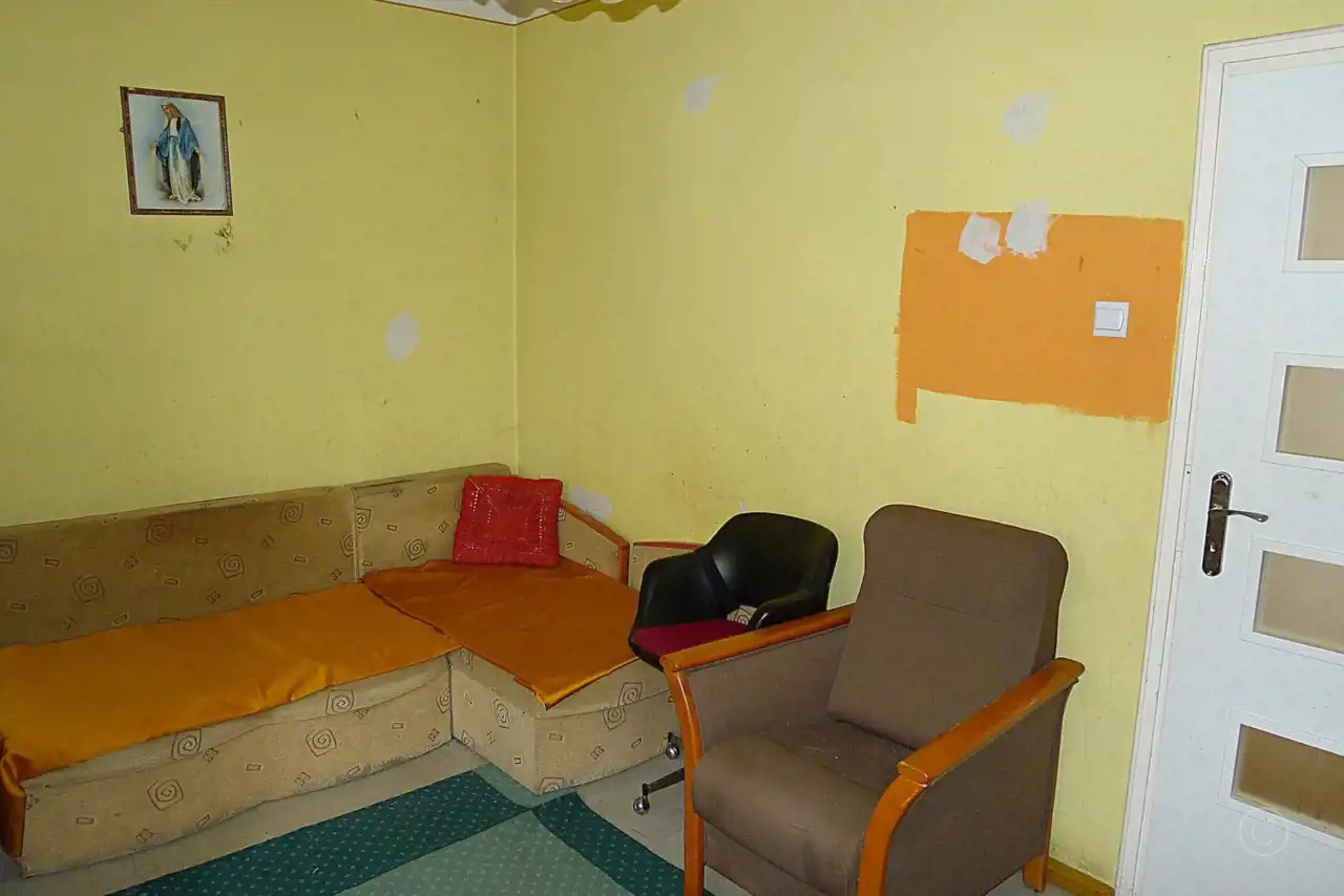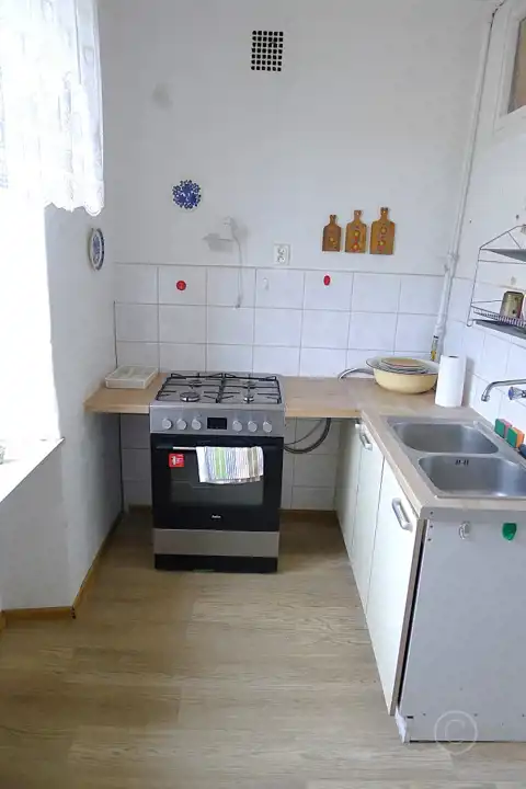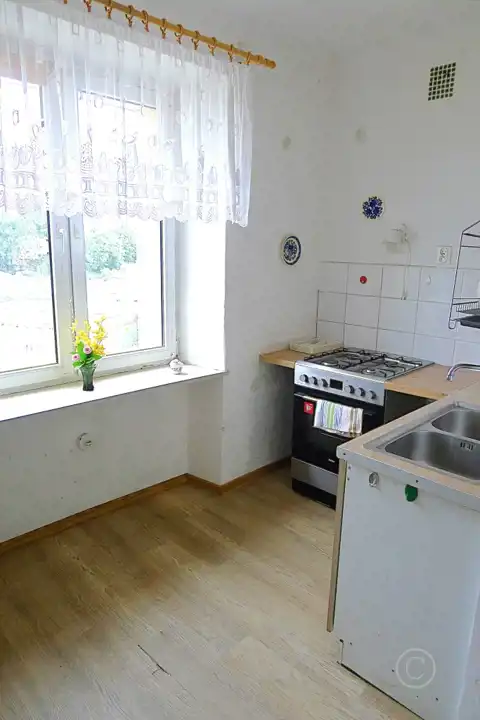 W dużym pokoju oraz kuchni na podłodze panele, na ścianach gładź gipsowa, malowana. W kuchni na ścianach częściowo glazura. W łazience (razem z WC) na podłodze terakota, na ścianach glazura, kabina prysznicowa, umywalka, WC. W kuchni: kuchnia gazowa, zlewozmywak w zabudowie. Mieszkanie rozkładowe. Okna PCV.