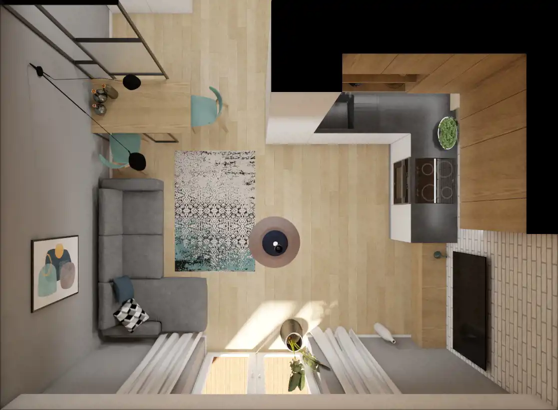 *pokój z aneksem kuchennym i wyjściem na taras