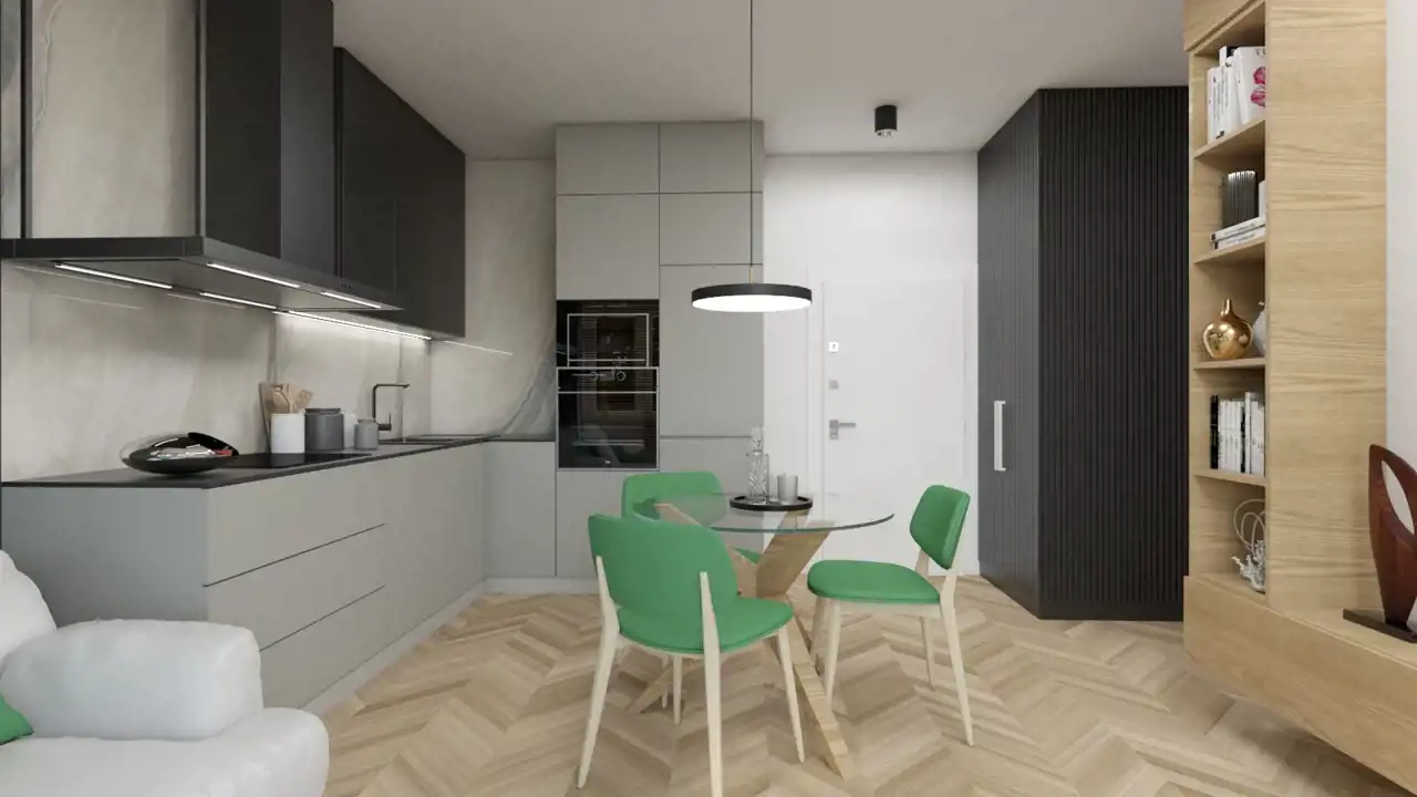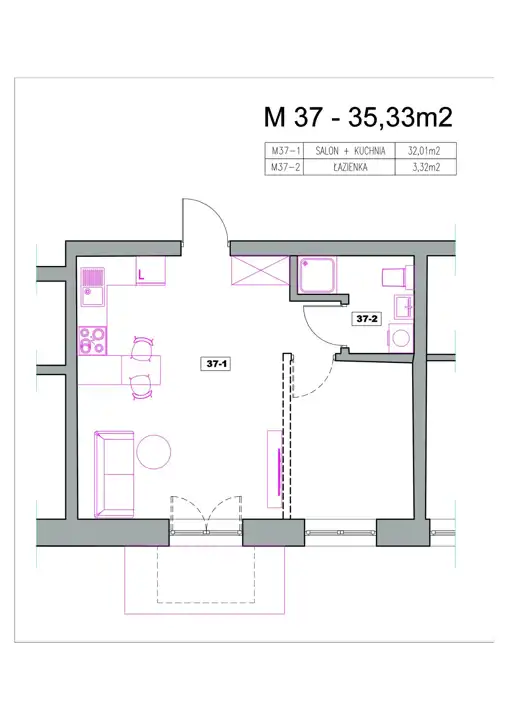 - Charakterystyka mieszkania 36.77 m2, 2 pokoje