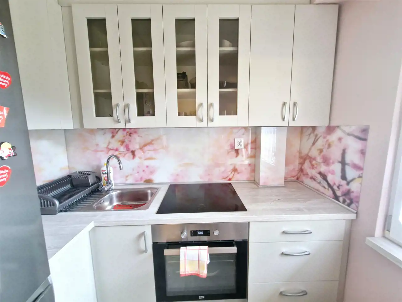 W kuchni szafki wraz z lodówką, kuchnią indukcyjną , piekarnikiem.