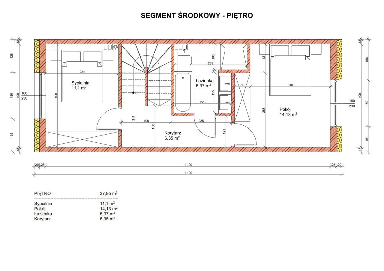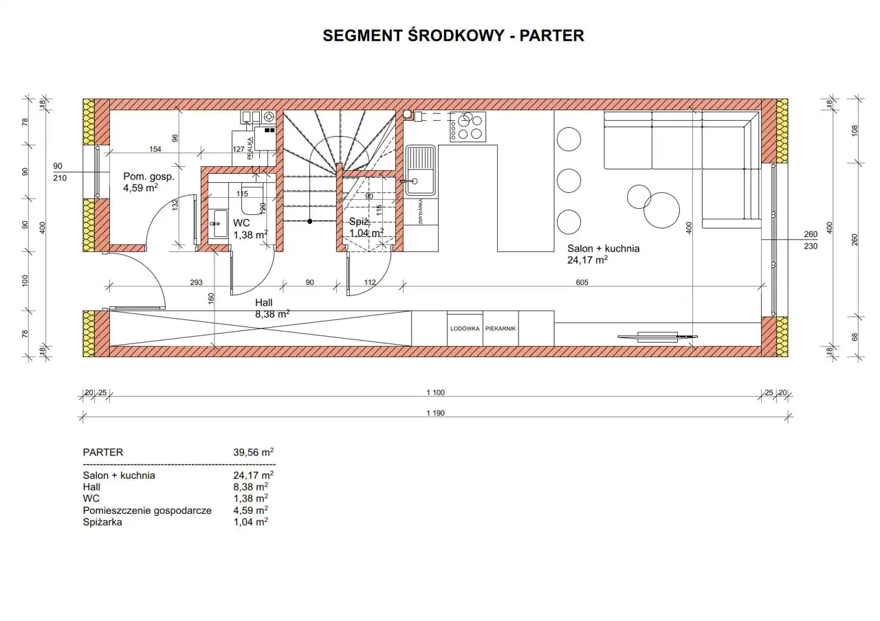 Na parterze: salon + kuchnia 24,17 m2 , hall 8,38 m2 wc 1,38 m2 , pomieszczenie gospodarcze 4,59 m2, spiżarka 1,04 m2. Na piętrze: sypialnia 11,1 m2, pokój 14,13 m2 , łazienka 6,37 m2 , korytarz 6,35 m2.