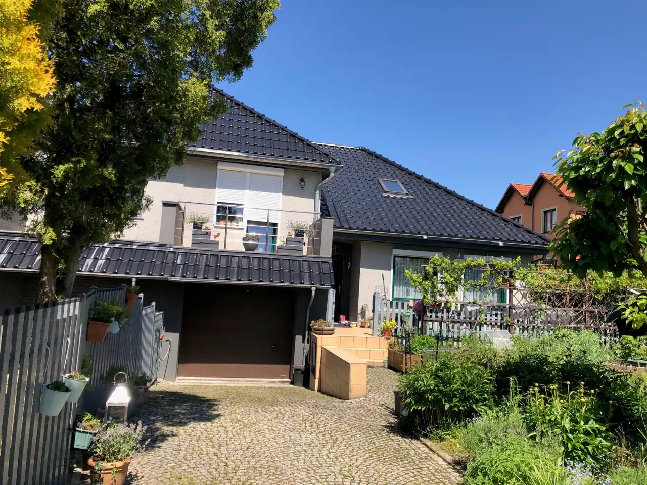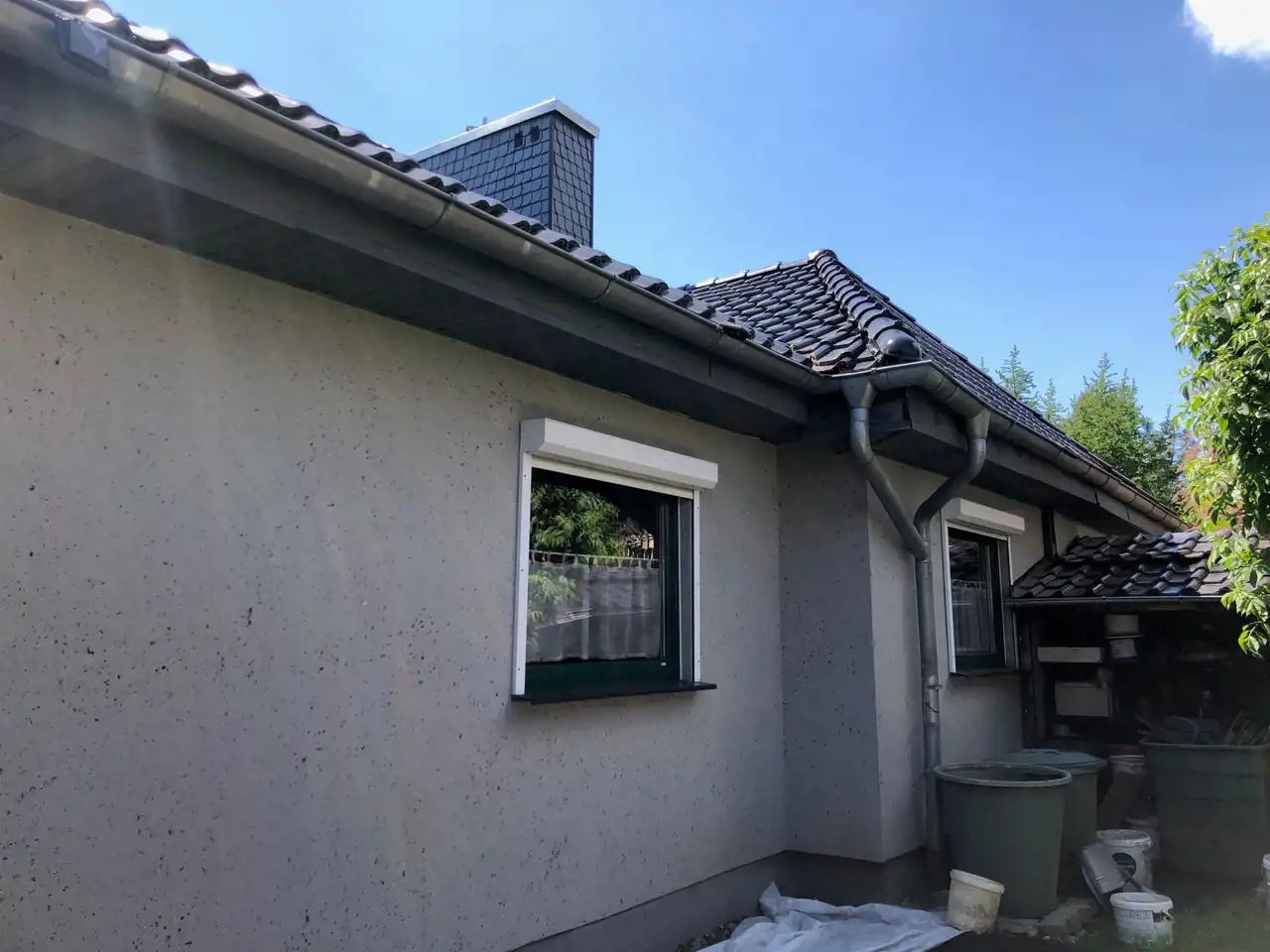 Budynek na zewnątrz prezentuje się bardzo dobrze. Uwagę przyciąga grafitowy dach, wykonany z dachówki, nowe rynny, nowa elewacja.