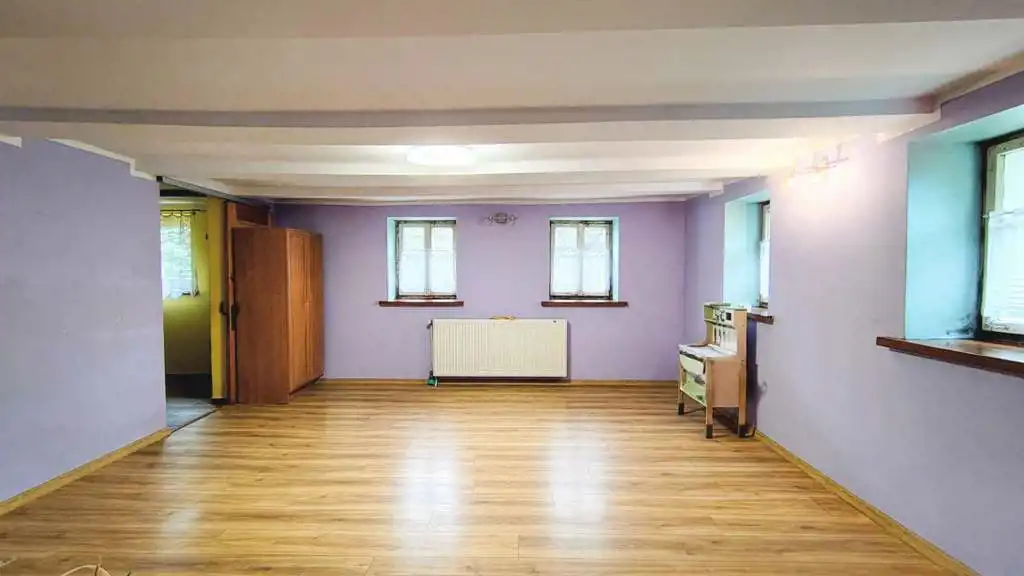 Parter części mieszkalnej po obrysie podłóg wynosi około 73,50 m2 i obejmuje: 3 pokoje, kuchnię, łazienkę, wiatrołap oraz kotłownię. Wysokość pomieszczeń waha się od około 1,85 m do około 2,25 m. Pozostała część parteru to część gospodarcza, która może zostać wykorzystana jako garaż (szeroka brama wjazdowa) oraz typowe pomieszczenia gospodarcze. Poddasze obejmuje 3 pokoje, 2 pomieszczenia gospodarcze i przedpokój. Wysokość pomieszczeń waha się od około 1,70 m do około 2,26 m.