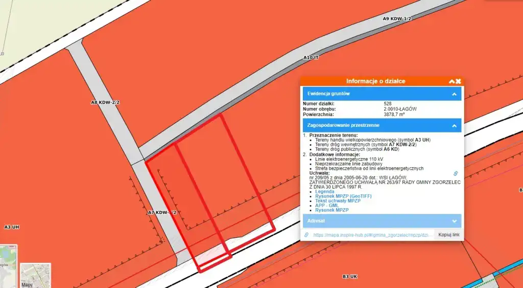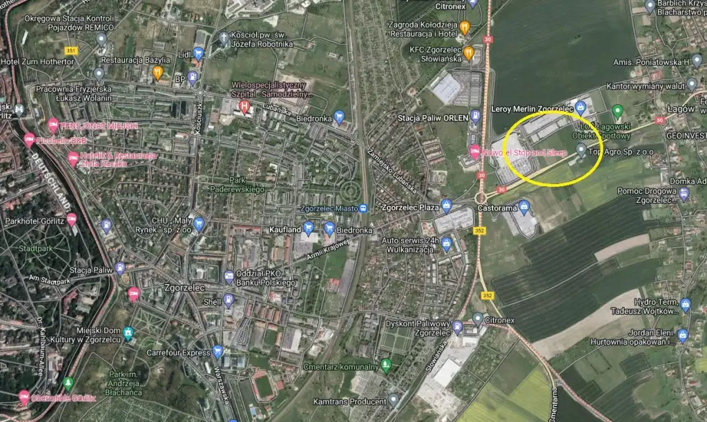 Do sprzedania nieruchomość gruntowa o charakterze komercyjnym znajdująca się miejscowości Łagów, gmina Zgorzelec (woj. dolnośląskie), w bezpośrednim otoczeniu obiektów handlowych takich jak Galeria Słowiańska, Castorama, Leroy Merlin, Decathlon, Zgorzelec Plaza. Kompleks będący przedmiotem sprzedaży składa się z 3 działek o numerach ewidencyjnych 525, 528, 527 łącznej powierzchni 1 0266 m2. Teren jest płaski i posiada regularny kształt zbliżony do prostokąta o przybliżonych wymiarach 85 m x 120 m. Dostępne media: prąd, woda, gaz oraz kanalizacja w sąsiedztwie działki. W planie zagospodarowania przestrzennego teren oznaczony jest symbolem A3-UH – tereny handlu wielkopowierzchniowego, A6KD- tereny dróg publicznych. Plan zagospodarowania przestrzennego dopuszcza także na tym obszarze usługi hotelarskie, gastronomii, rozrywki oraz budowę stacji paliw. Teren położony jest bezpośrednio przy drodze krajowej numer 30 Zgorzelec-Jelenia Góra, o bardzo dużym natężeniu ruchu. Lokalizacja także dobrze skomunikowana z obwodnicą miasta i drogą wojewódzką 352 w kierunku Bogatyni i czeskiego przejścia granicznego, a także zjazdu na autostradę A4 w odległości 2 km i przejścia granicznego w Jędrzychowice/Ludwigsdorf w odległości 4,5 km.
