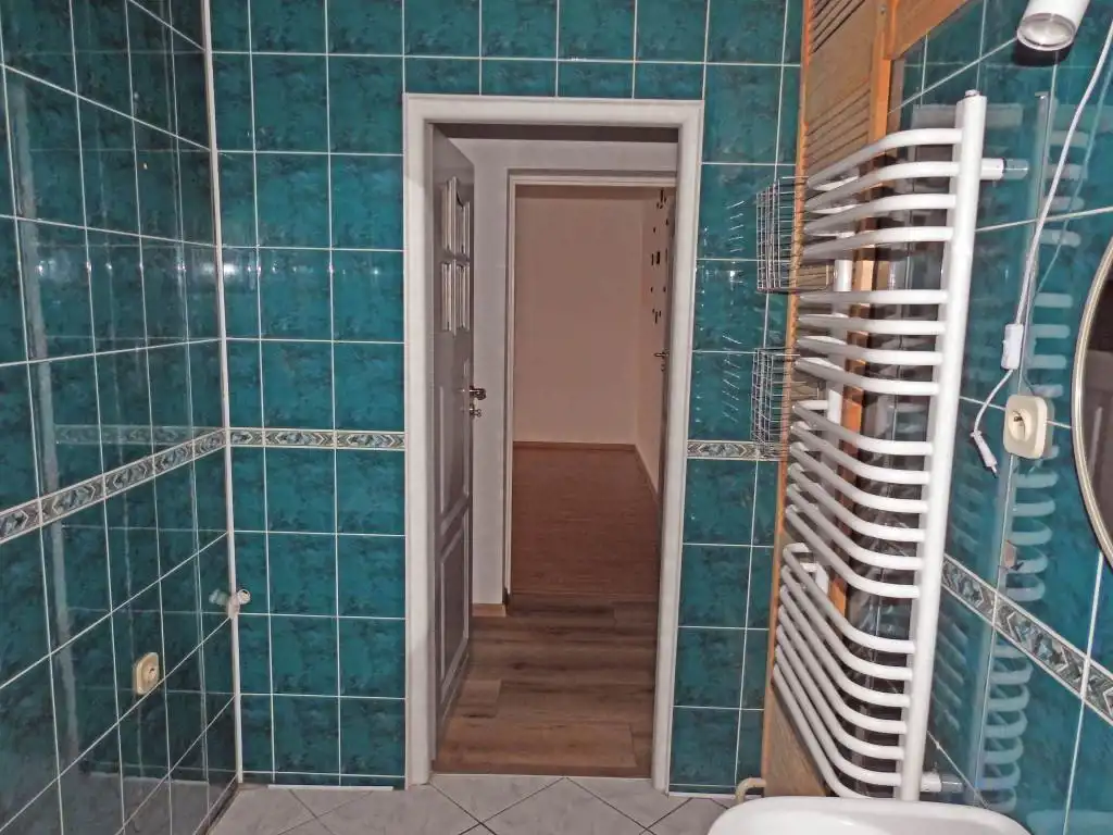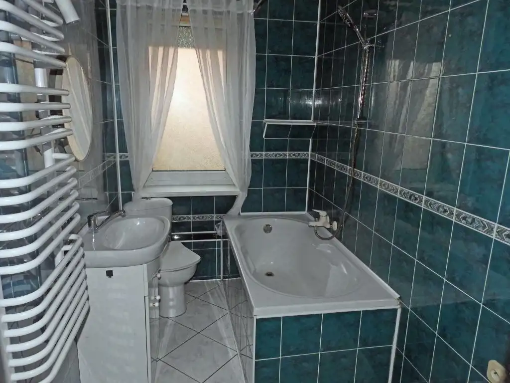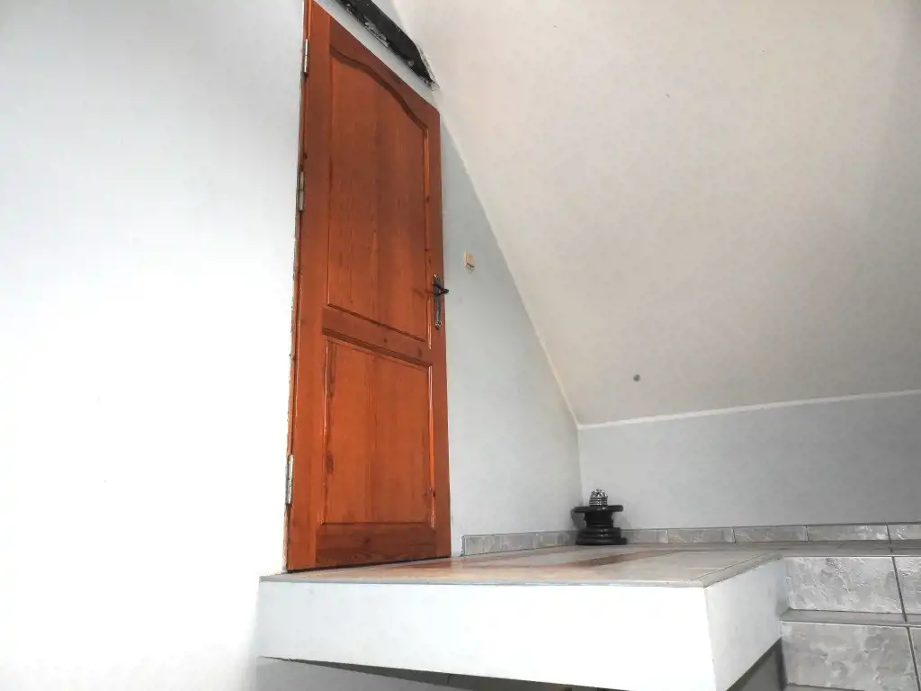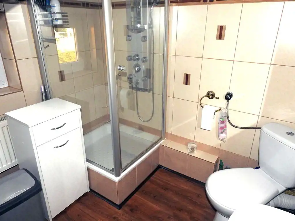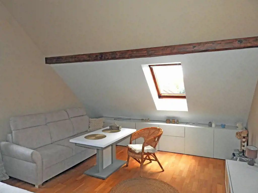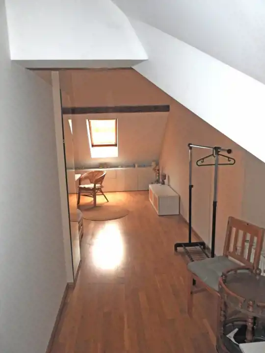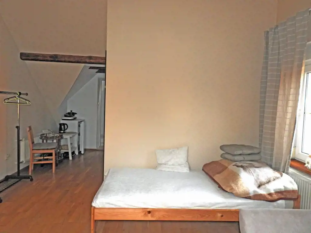 Znajdujące się na poddaszu przynależne pomieszczenie gospodarcze zostało adoptowane na kawalerkę. W pomieszczeniu tym znajduje się wygodny i przestronny pokój (z możliwością urządzenia w nim aneksu kuchennego) oraz łazienka. W tym pomieszczeniu zamontowana jest kabina prysznicowa, umywalka i muszla klozetowa.