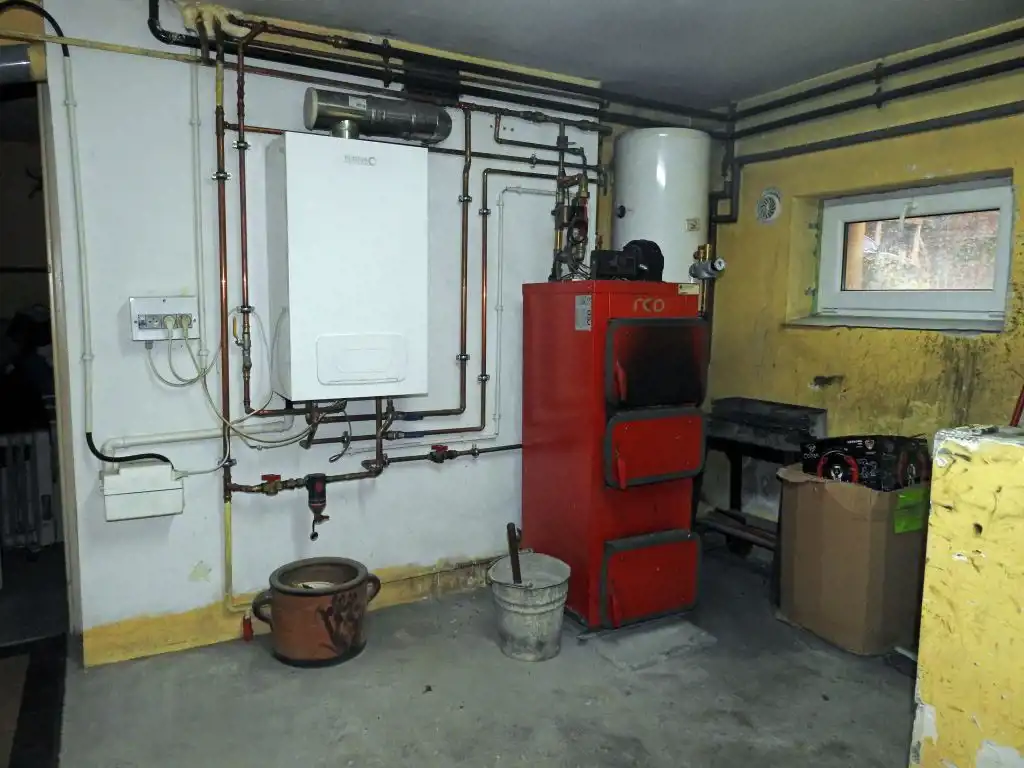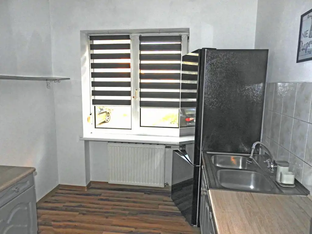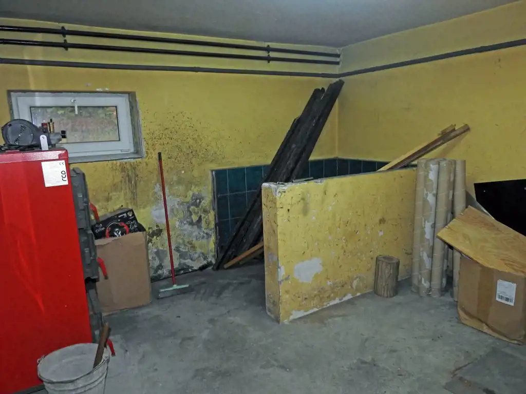 Obie części mieszkalne (na parterze i poddaszu) mają zainstalowane c.o. zasilane znajdującym się w piwnicy, nowym 2 funkcyjnym kotłem gazowym. Mieszkania są zadbane, nadające się do natychmiastowego użytkowania. W 2 przynależnych do mieszkania piwnicach znajduje się m. innymi kotłownia. W niej oprócz wspomnianego kotła gazowego jest zainstalowany także sprawny, piec na paliwo stałe oraz zasobnik ciepłej wody. Jest tu też wydzielone miejsce na składowanie węgla. W piwnicy jest przejście do dużego garażu zamykanego segmentową bramą otwieraną elektrycznie (na pilota). Pomieszczenia na wszystkich kondygnacjach (w tym drugi znajdujący się w budynku drugi lokal mieszkalny) skomunikowane są wspólną zabudowaną klatką schodową. Udział właścicieli obu nieruchomości lokalowych wynosi po ½ w częściach wspólnych budynku i działki gruntu, której powierzchnia wynosi 759 m kw. Przy czym sposób korzystania przez nich z działki został uzgodniony notarialnie.