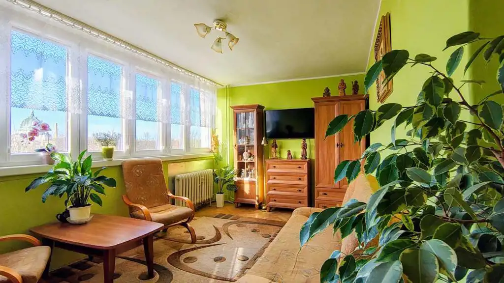 Mieszkanie jednopokojowe, umeblowane, położone na V piętrze bloku z windą. Powierzchnia lokalu wynosi ok 25 m2 i obejmuje słoneczny salon, przedpokój, niewielką kuchnię oraz łazienkę z wc wyposażoną w prysznic. Do wyłącznego użytku jest także piwnica. Z okien mieszkania roztacza się piękny widok na park, Miejski Dom Kultury i wygasły wulkan Landeskrone.