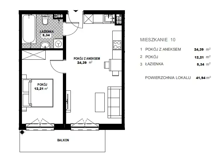 Powierzchnia mieszkania wynosi 41,94 m2 i obejmuje pokój z aneksem kuchennym, sypialnię (oba pomieszczenia z wyjściem na balkon) oraz łazienkę.