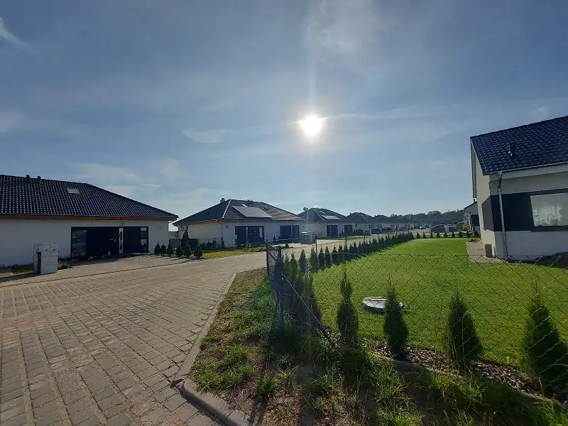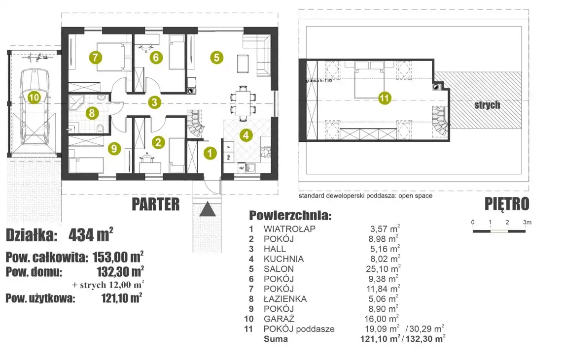 Fantastyczne osiedle domów w zabudowie bliźniaczej. Dom o powierzchni użytkowej 121,10 m2, stojący na działce o powierzchni 434 m2 składa się z salonu z aneksem kuchennym o pow. 33,12 m2, czterech pokoi na parterze o pow. 11,84 m2, 9,38 m2, 8,98 m2, 8,90 m2 oraz jednego na poddaszu o pow. po podłodze 30,29 m2, łazienki z WC o pow. 5,06 m2, wiatrołapu o pow. 3,57 m2 oraz hallu o pow. 5,16 m2. Do domu przynależy garaż o pow. 16,00 m2 oraz strych o pow. 12 m2.