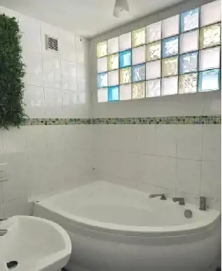 Łazienka co prawda nie posiada okna ale ma luksfery w ścianie co powoduje że mimo to wpada tam światło dnia.