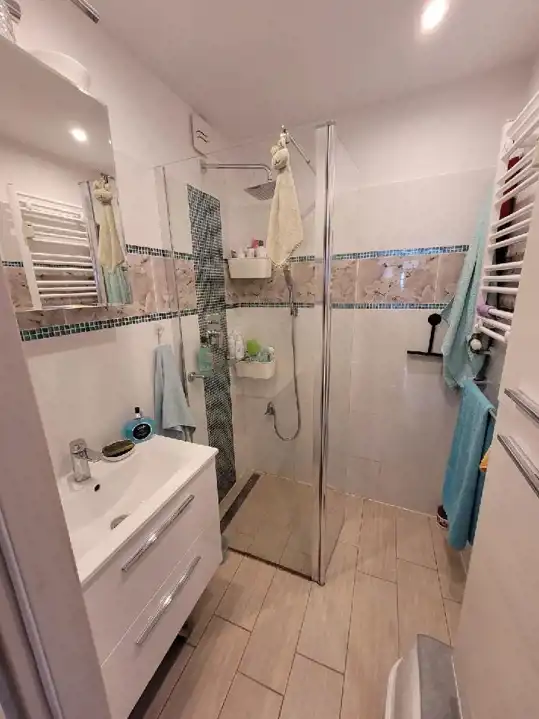 ŁAZIENKA: na podłodze gres a na ścianach płytki, prysznic, umywalka.