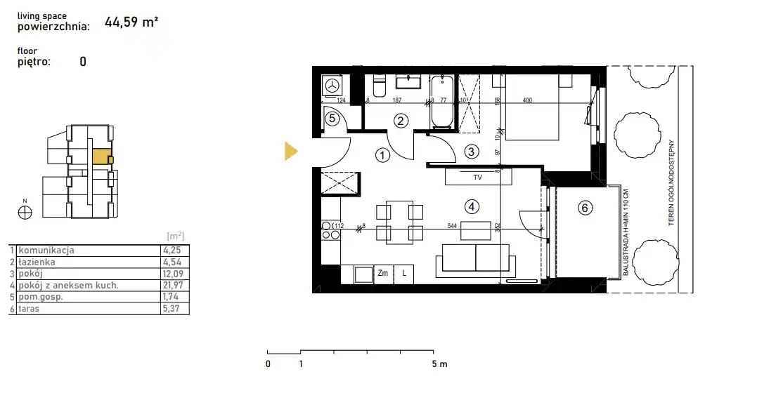 - Charakterystyka mieszkania 44.59 m2, 2 pokoje