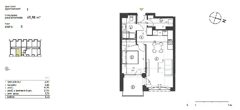 - Charakterystyka mieszkania 45.98 m2, 2 pokoje