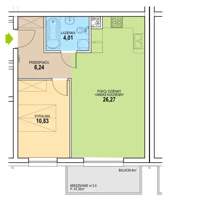 - Charakterystyka mieszkania 47.55 m2, 2 pokoje