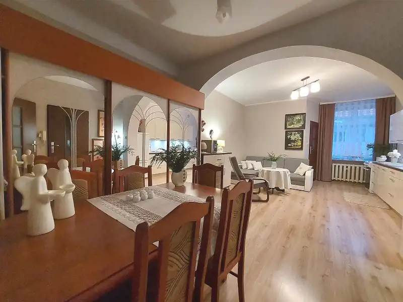 Przestronny lokal mieszkalny o powierzchni 77,40 m2 usytuowany jest w samym centrum miasta przez co doskonale nadaje się pod inwestycję, a także do zaadaptowania pod lokal biurowy czy kancelarię, jak i do zamieszkania przez rodzinę. Nieruchomość znajduje się na pierwszym piętrze zadbanej kamienicy, w której wymieniany był dach oraz odświeżana elewacja.