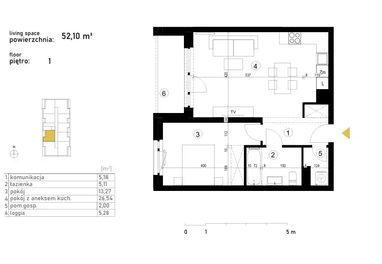 - Charakterystyka mieszkania 52.1 m2, 2 pokoje