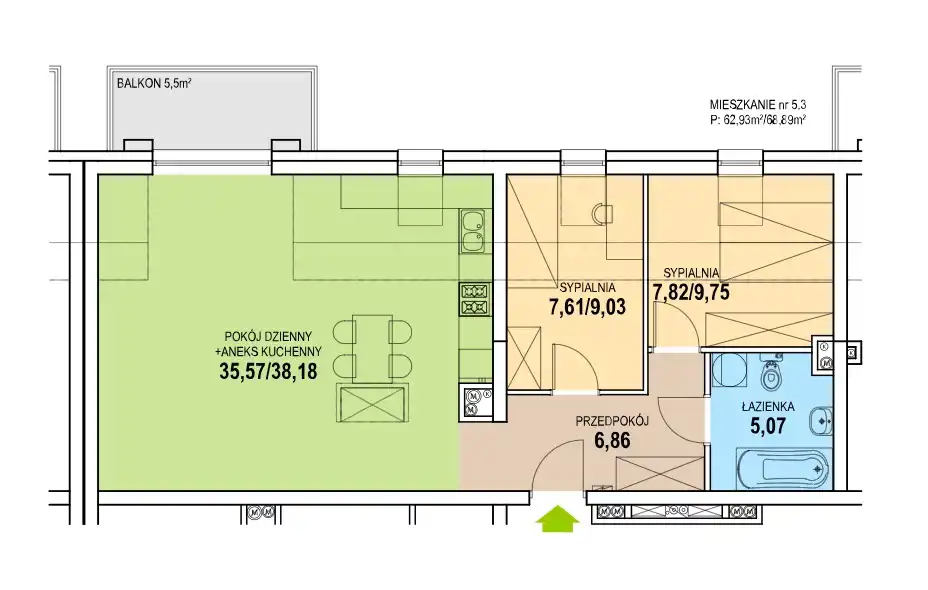 - Charakterystyka mieszkania 63.69 m2, 3 pokoje
