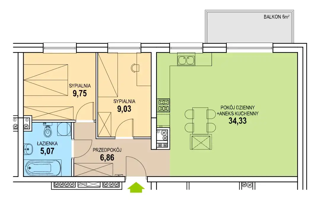 Nieruchomość o powierzchni 65,41 m2 usytuowana jest na III piętrze nowoczesnego bloku z cichobieżną windą. Mieszkanie składa się z salonu z aneksem kuchennym o pow. 34,33 m2 z wyjściem na balkon, dwóch sypialni o pow. 9,75 m2 oraz 9,03 m2, łazienki z WC o pow. 5,07 m2 oraz holu o pow. 6,86 m2.