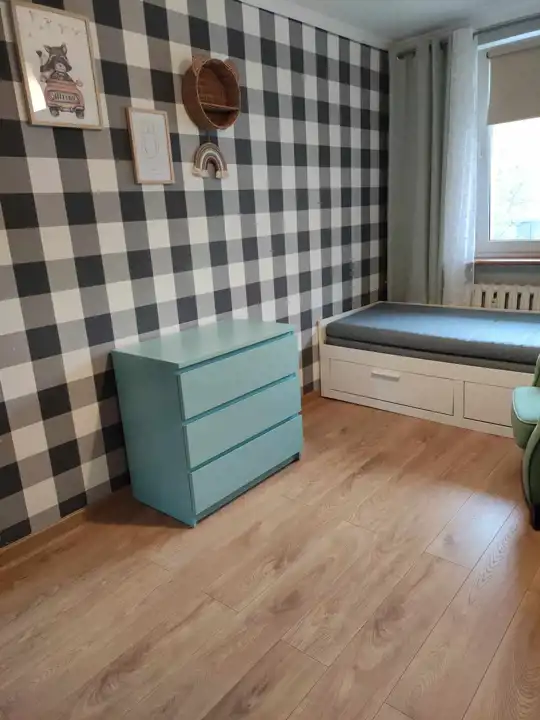 SYPIALNIA NR 2: na podłodze panele, ściany gładzone i malowane oraz na części ściany ozdobna tapeta.