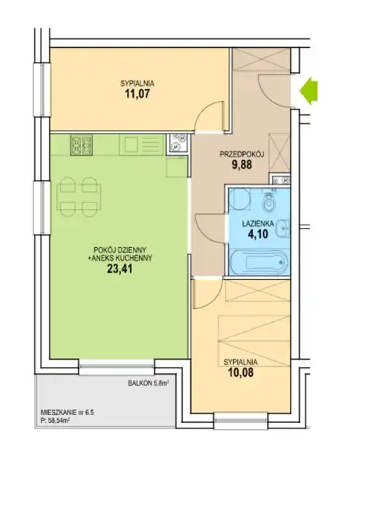 - salonu z aneksem kuchennym (23,41 m2) z wyjściem na balkon (5,8 m2)
