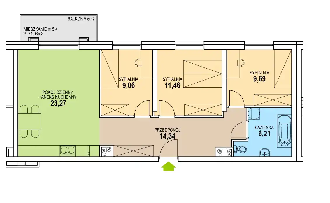 Nieruchomość o powierzchni 73,94 m2 usytuowana jest na VI piętrze (ostatnim) nowoczesnego bloku z cichobieżną windą. Mieszkanie składa się z salonu z aneksem kuchennym o pow. 23,27 m2 z wyjściem na balkon, 3 sypialni o pow. 11,46 m2, 9,69 m2, 9,06 m2, łazienki połączonej z WC o pow. 6,21 m2 oraz przedpokoju o pow. 14,34 m2. Do mieszkania przynależy balkon o pow. 5,6 m2.