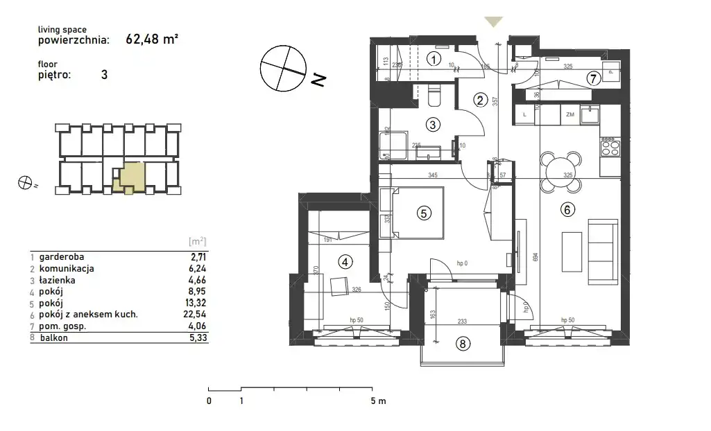 - Charakterystyka mieszkania 62.48 m2, 3 pokoje