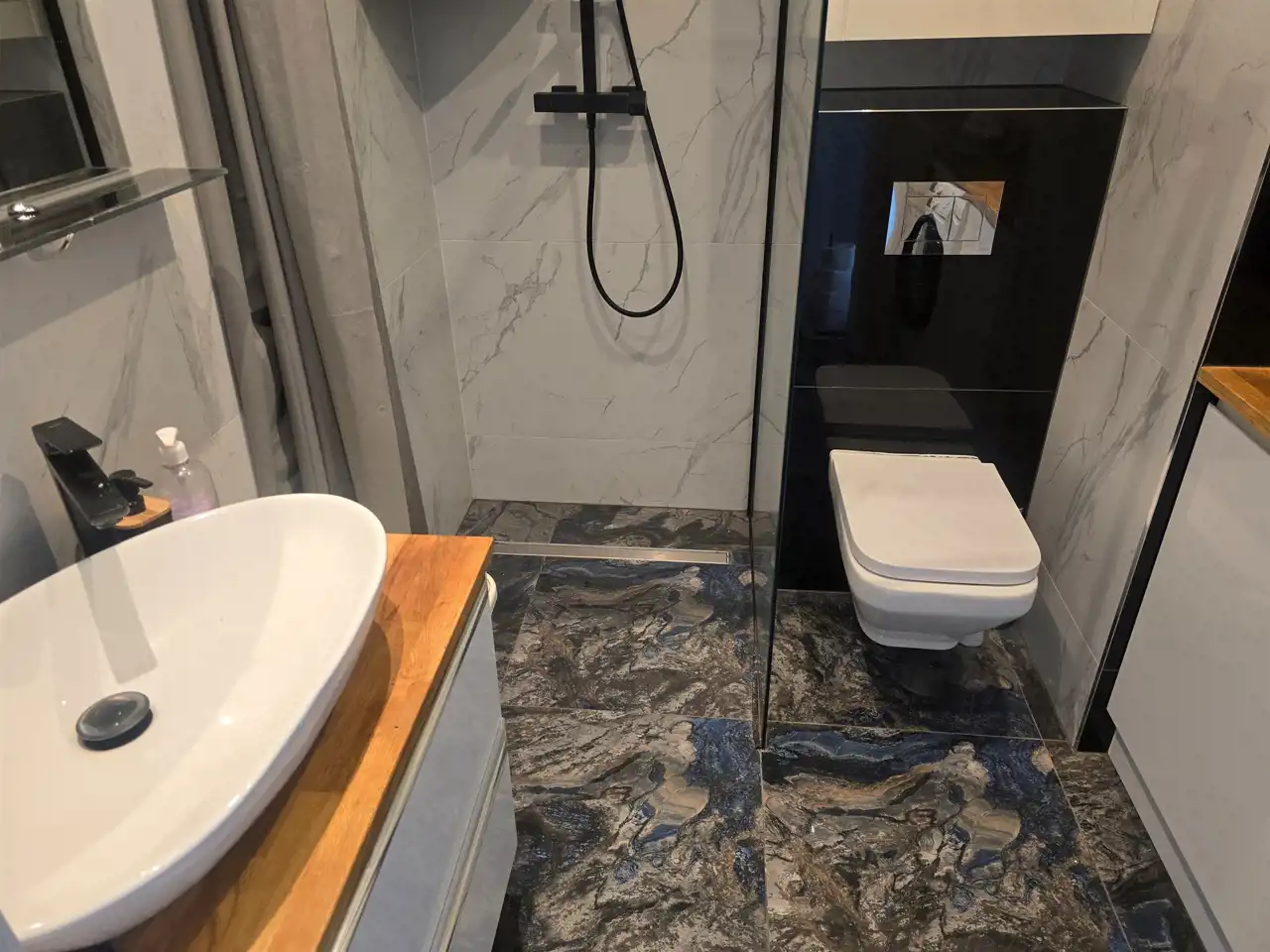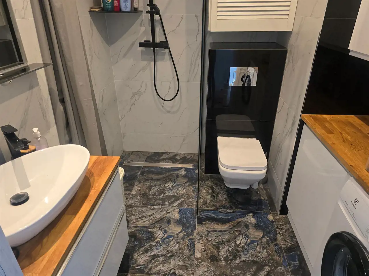 - Łazienka – o pow. 4,19 m², funkcjonalnie urządzona, z pralką pod drewnianym blatem, brodzikiem, zabudowanym piecem gazowym marki Viessmann