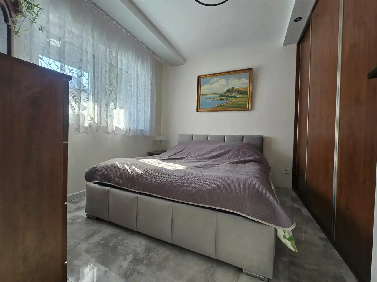 - Sypialnia – o pow. 10,75m² komfortowe łóżko małżeńskie (1,6 m x 2,2 m), przestronna szafa (3,2 m x 2,55 m), komoda i szafka nocna.