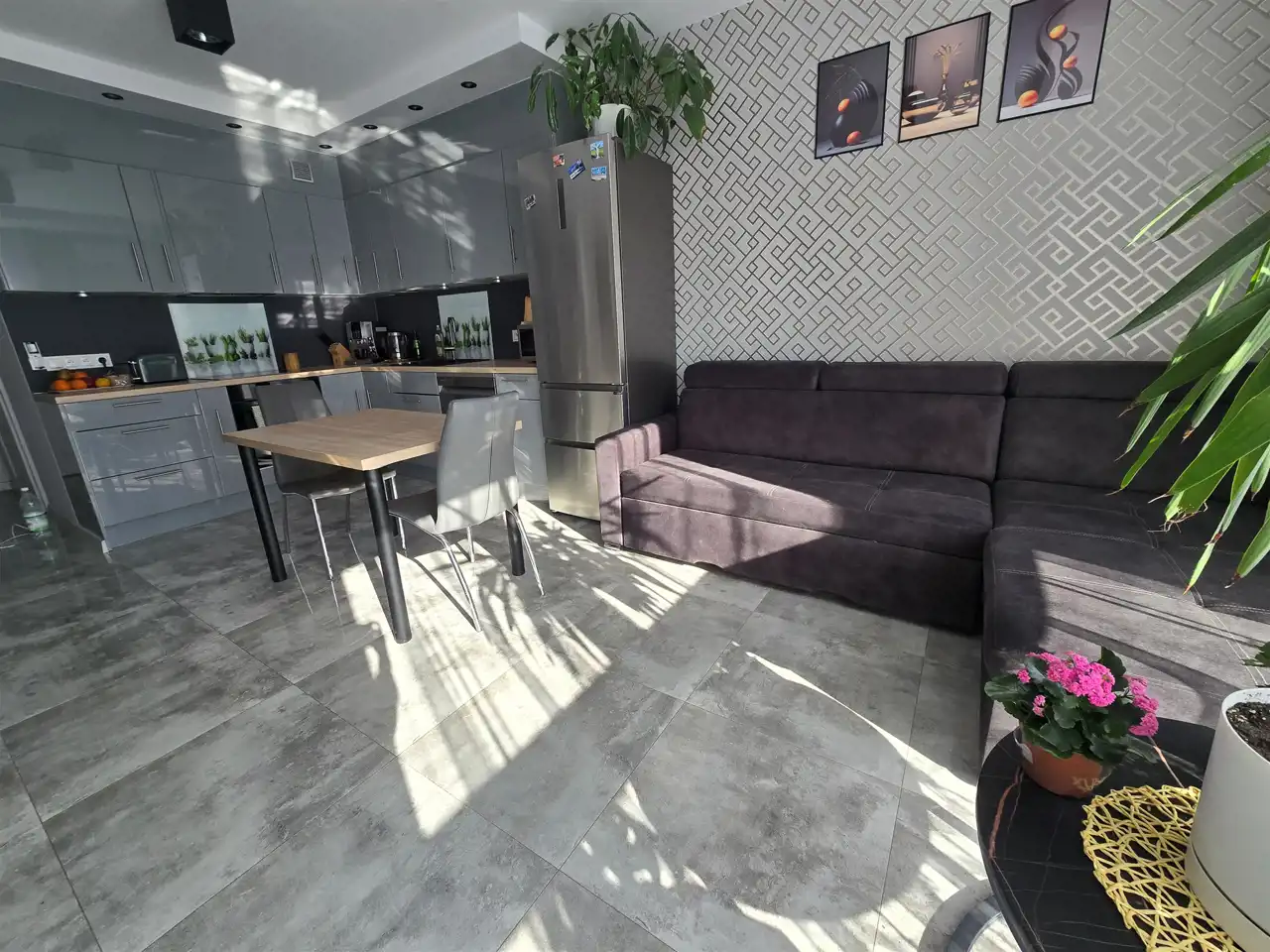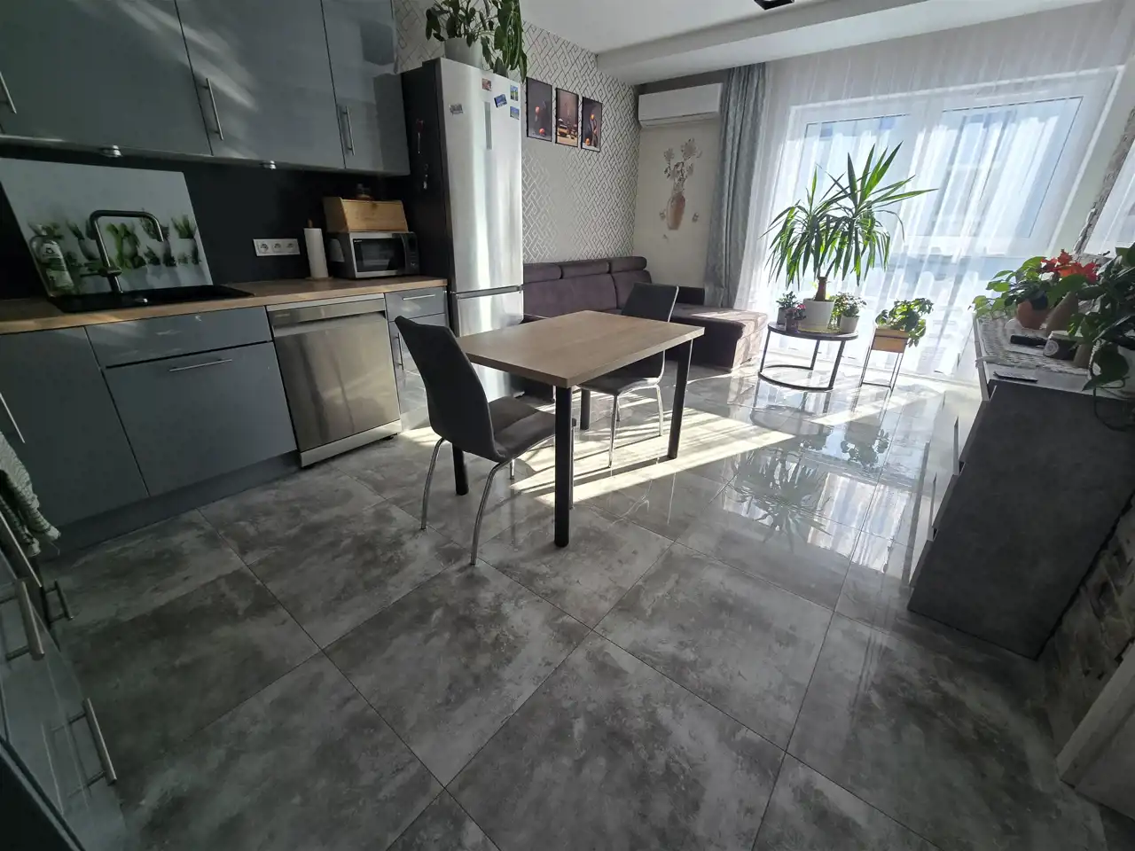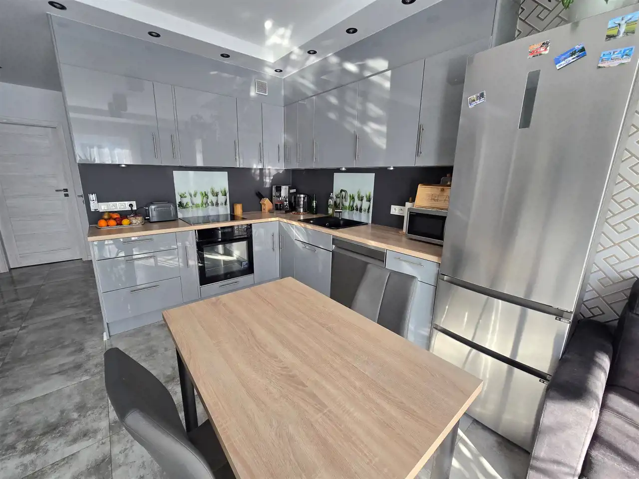 - Salon z aneksem kuchennym – o pow. 20,46m², klimatyzowany, wyposażony w duży narożnik, stół oraz wysokiej klasy sprzęt AGD (lodówka, zmywarka, piekarnik, płyta indukcyjna, okap) z salonu wyjście na duży balkon.