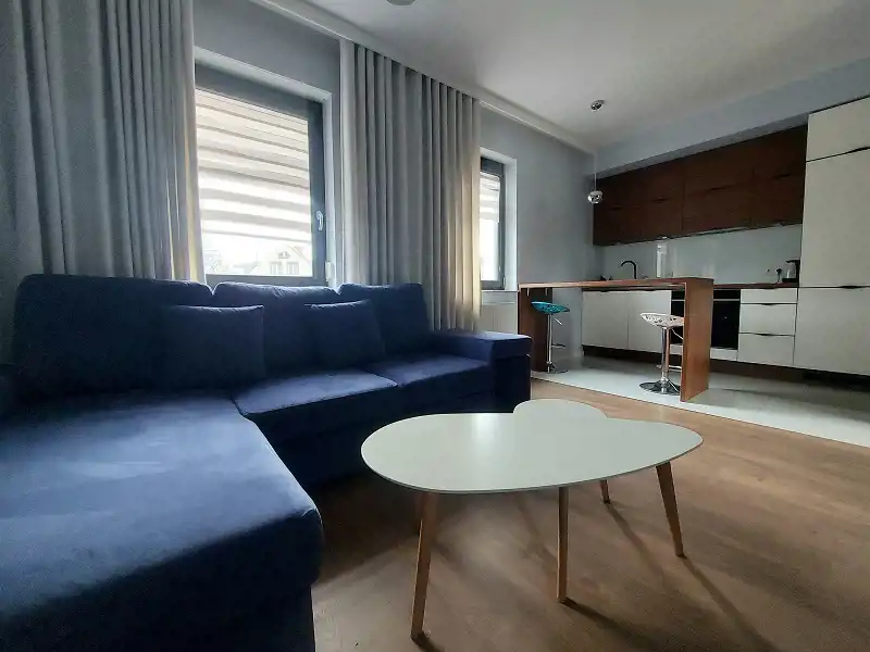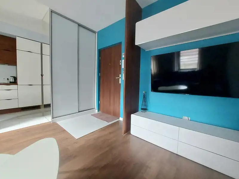 Salon dzienny połączony z aneksem kuchennym, przedpokój z szafą przesuwną z lustrem, łazienka wraz z WC