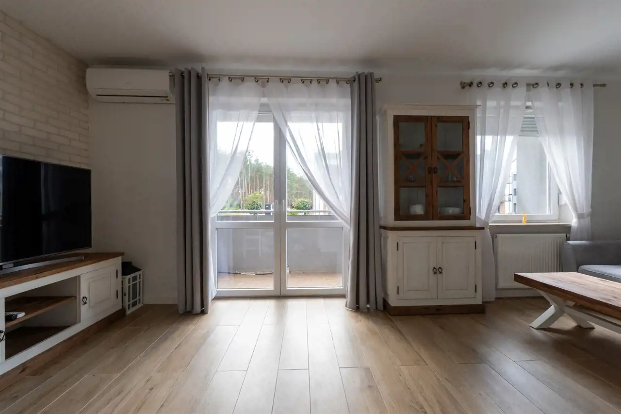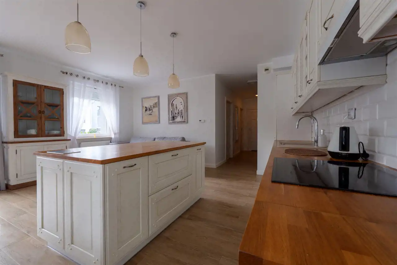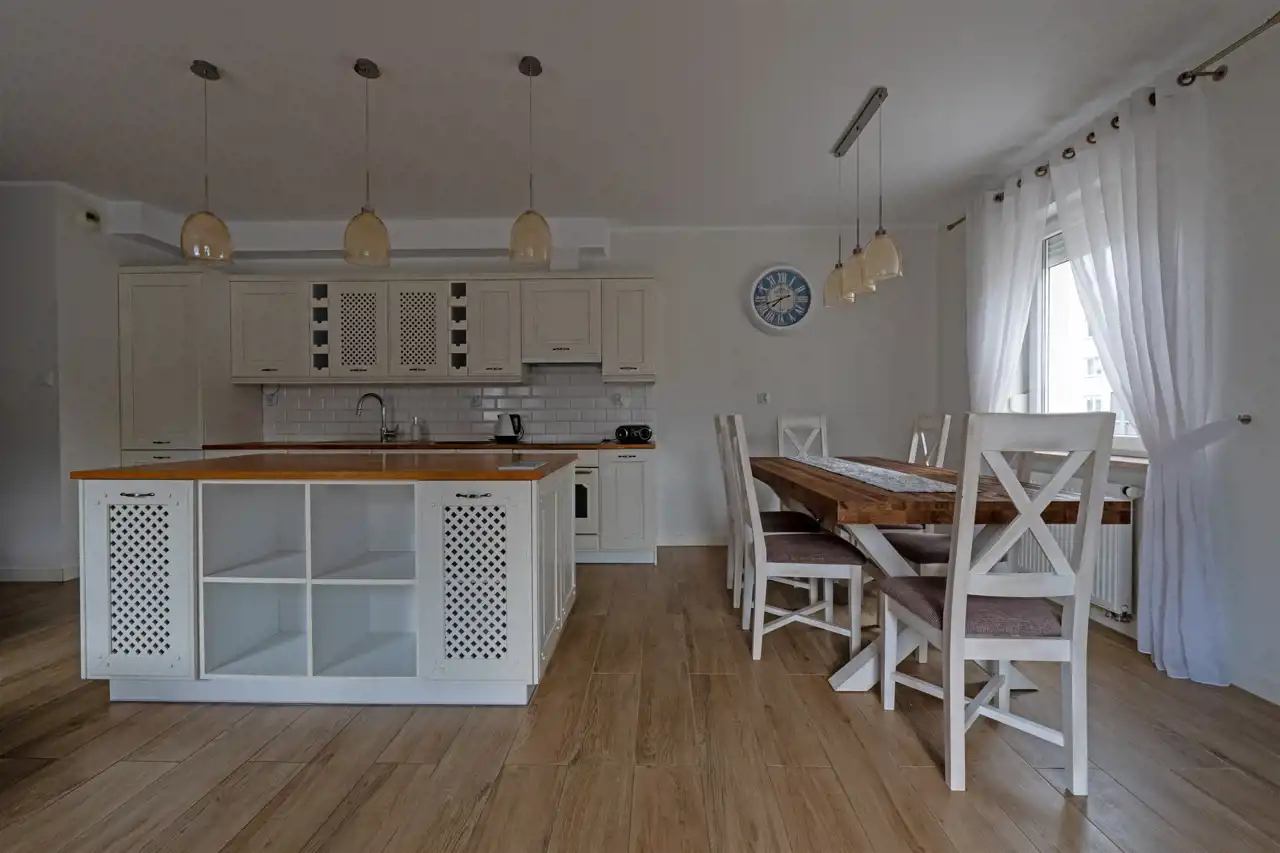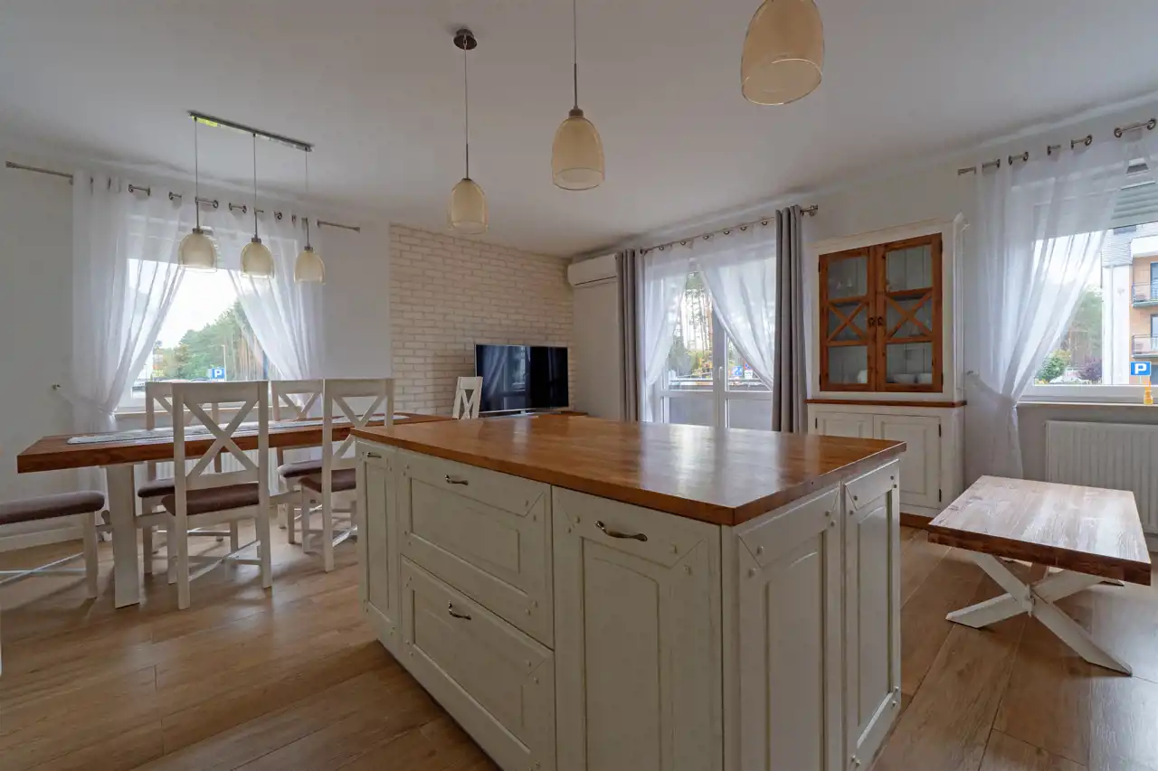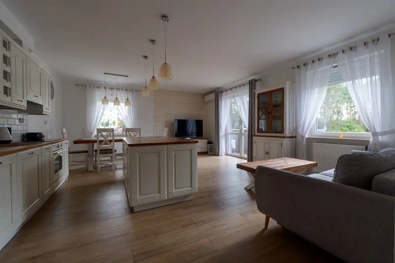 - klimatyzowany salon z jadalnią i aneksem kuchennym, wyposażonym w pełny sprzęt AGD (zmywarka, płyta indukcyjna, piekarnik, lodówko-zamrażarka, okap) – idealna przestrzeń do wspólnego spędzania czasu,