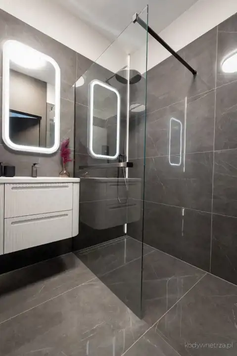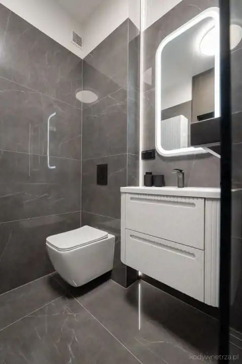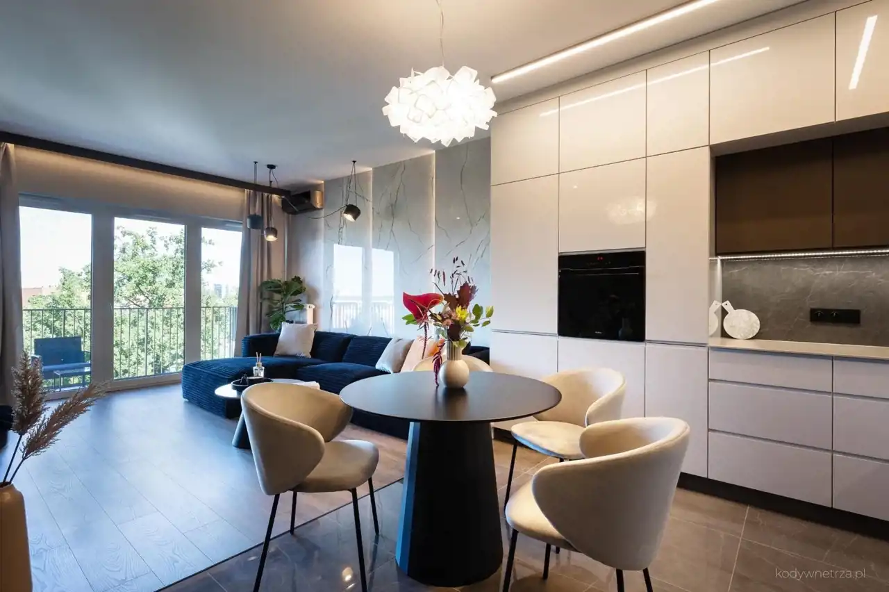 - Z przestronnego salonu połączonego z aneksem kuchennym, który tworzy elegancką harmonijną strefę dzienną - wyróżnia go - duży designerski narożnik, stylowe oświetlenie sufitowe i punktowe, piękne wykończenie ściany z motywem marmuru, a panoramiczne okna zapewniające naturalne światło z wyjściem na balkon, jako idealne miejsce na poranną kawę czy relaks wieczorem.