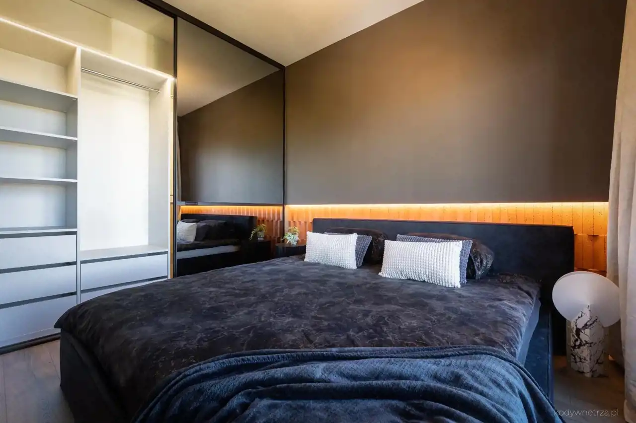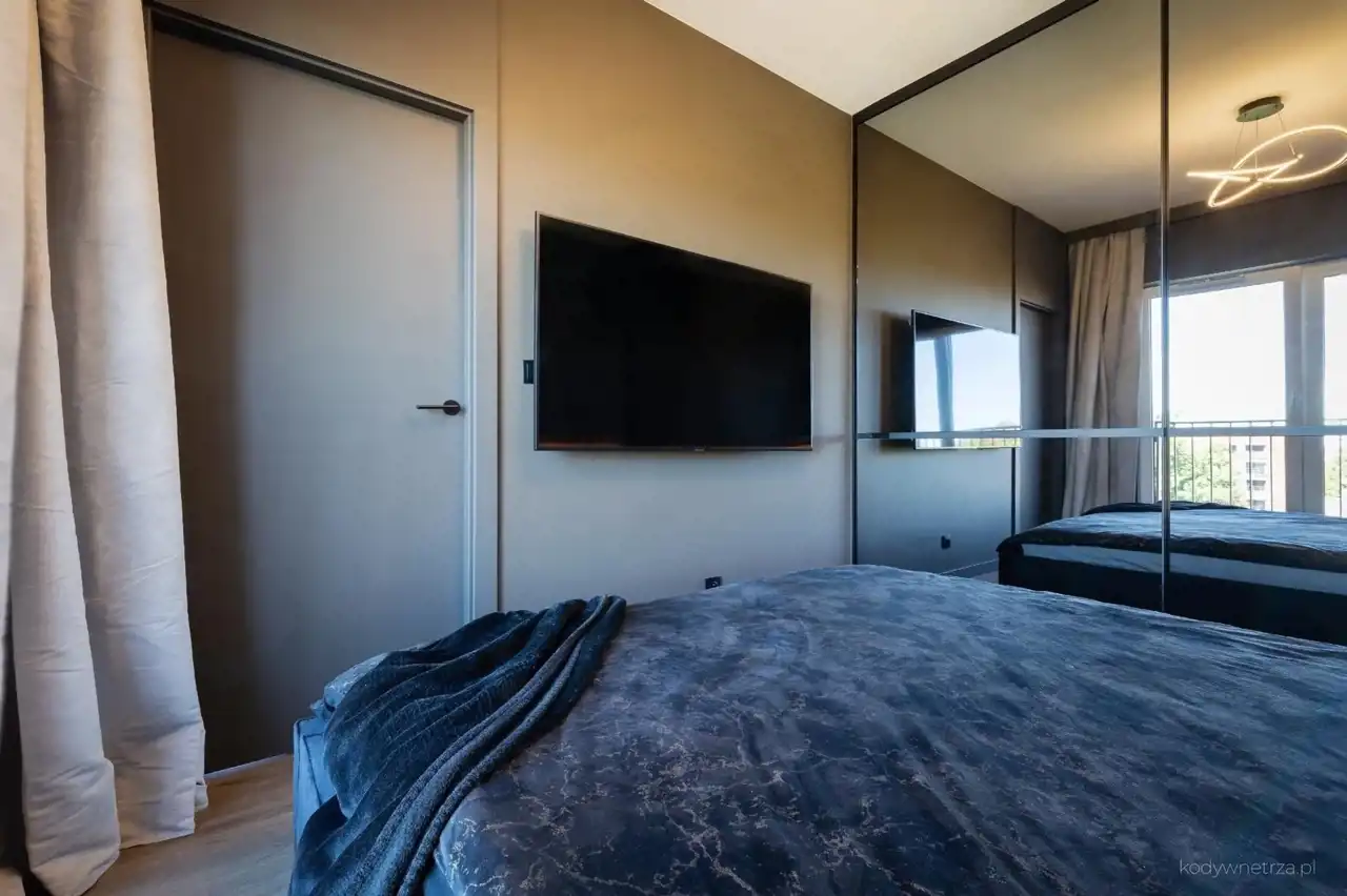 Przytulna sypialnia z dużym oknem, wyposażona w łóżko z wygodnym materacem oraz dużą i nowoczesną szafę z lustrem.