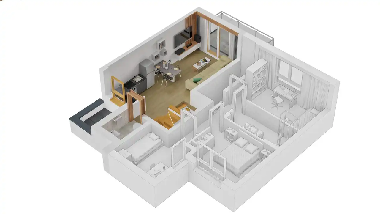 Poziom I (piętro) salon z aneksem kuchennym (21,5 m2) z wyjściem na balkon (6,5 m2), WC (2,75 m2).