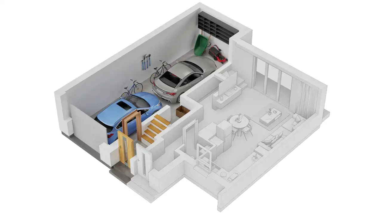 Poziom 0 (parter) – wiatrołap z wejściem na klatkę schodową (1,9 m2), garaż dwu stanowiskowy (32,66 m2).