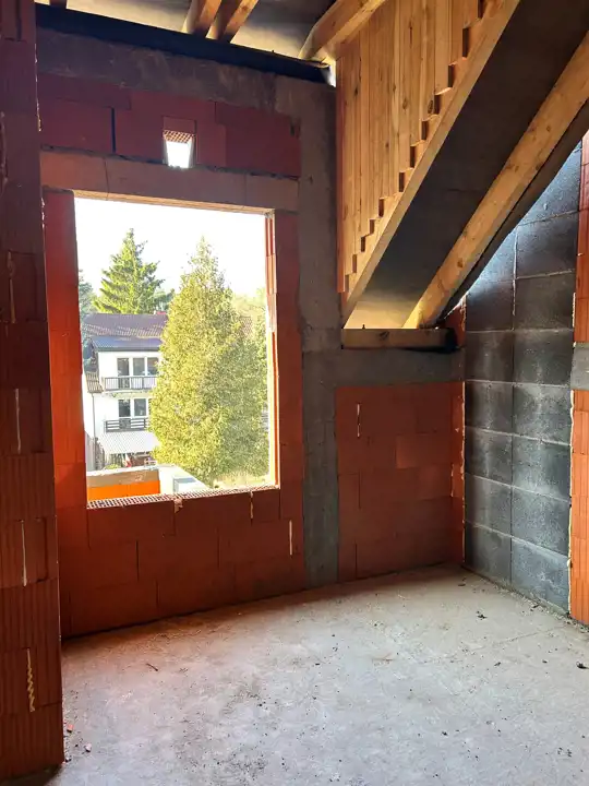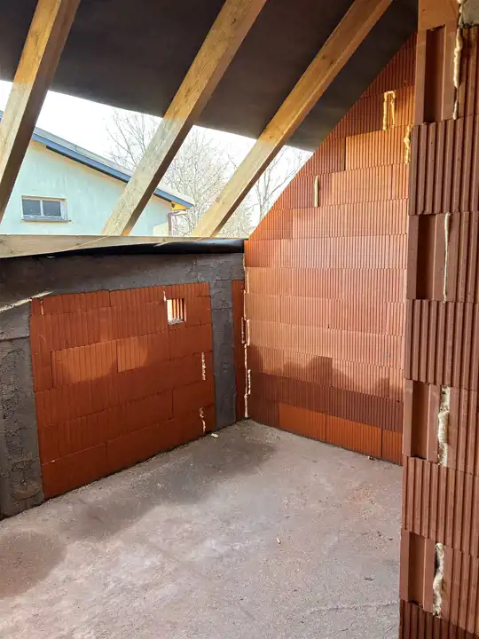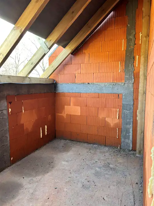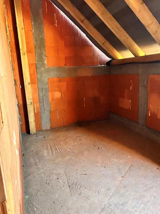 Wybudowany porotherm, ocieplony styropianem 20 cm oraz tynkiem elewacyjnym. Dach z blachodachówki, tynki gipsowe posadzki cementowe, okna PCV oraz dachowe 3 szt, drzwi antywłamaniowe, parapety, piec dwu-funkcyjny, ogrzewanie podłogowe na całości mieszkania. Instalacja alarmowa, tv, internet - przyłącze na dachu – pod antenę.