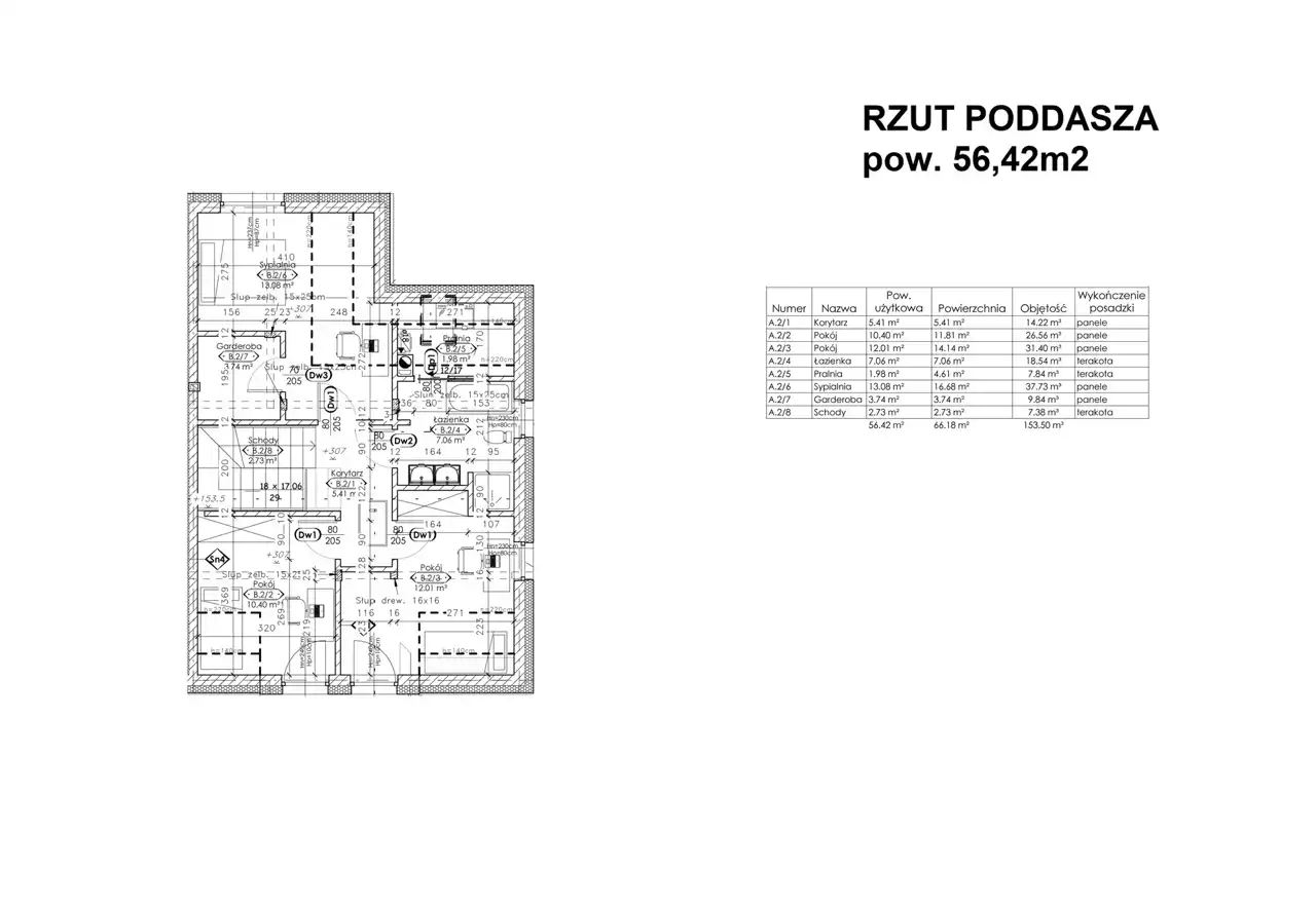 Poddasze: korytarz (5,41m2), pokój (10,4m2), pokój (12,01m2), łazienka (7,06m2), pralnia (1,98m2), sypialnia (13,08m2), garderoba (3,74m2), schody (2,73m2) - razem 56,42m2