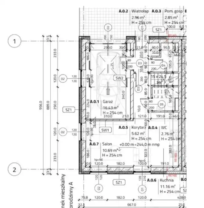 Parter: wiatrołap (2,96m2), garaż (16,43m2), korytarz (5,62m2), salon (10,69m2), kuchnia (11,16m2), WC (2,76m2), pom. gospodarcze (2,85m2)