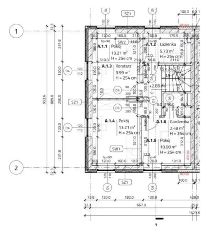 Piętro: pokój (13,21m2), łazienka (5,73m2), korytarz (3,99m2), pokój (13,21m2), łazienka (5,73m2), pokój (10,08m2), garderoba (2,48m2)