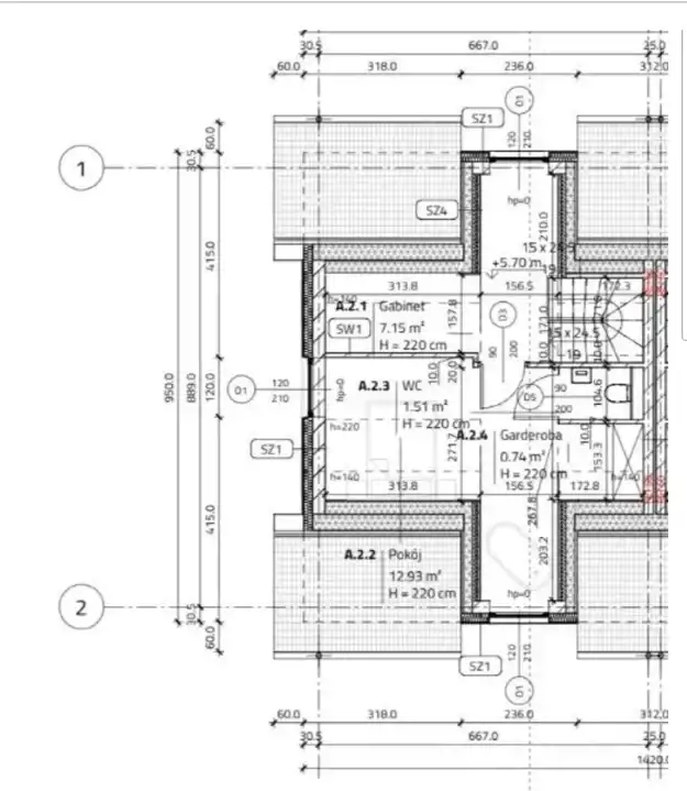 Poddasze: gabinet (7,15m2), pokój (12,93m2), WC (1,51m2)