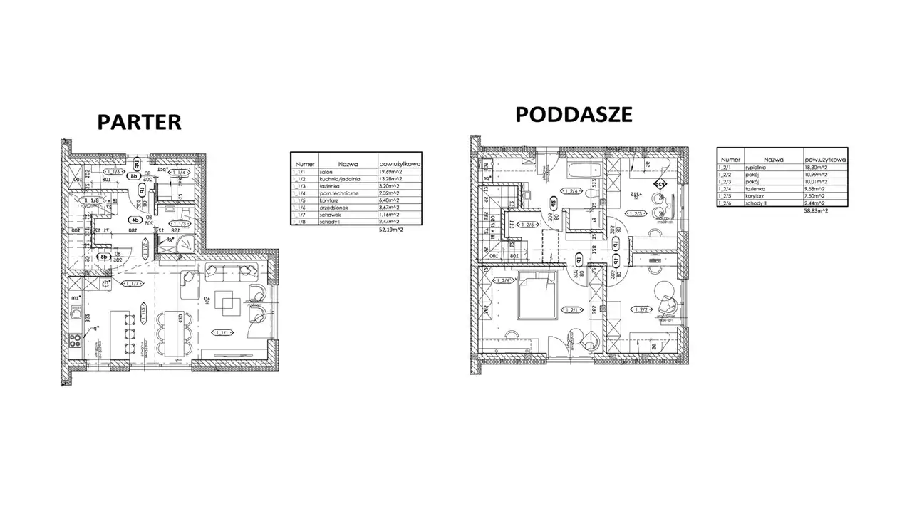 Poddasze: sypialnia (18,3m2), pokój (10,99m2), pokój (10,01m2), łazienka (9,58m2), korytarz (7,5m2), schody (2,44m2) - razem 58,83m2