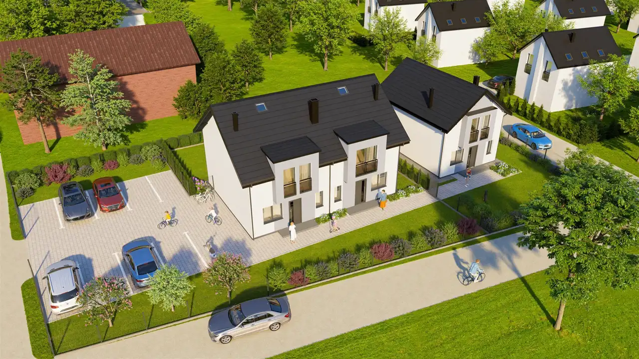 Dom z przynależnymi: trzema miejscami postojowymi, trzema sypialniami oraz dwiema łazienkami.