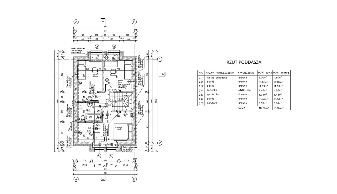 Poddasze: klatka schodowa (2,3m2), pokój (10,66m2), pokój (11,59m2), łazienka (4,45m2), garderoba (3,34m2), pokój (13,37m2), korytarz (3,07m2) - razem 48,78m2