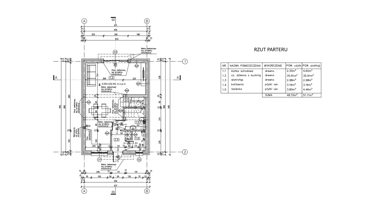 Parter: klatka schodowa (2,3m2), część dzienna z kuchnią (35,91m2), wiatrołap (2,98m2), kotłownia (3,16m2), łazienka (3,8m2) - razem 48,15m2